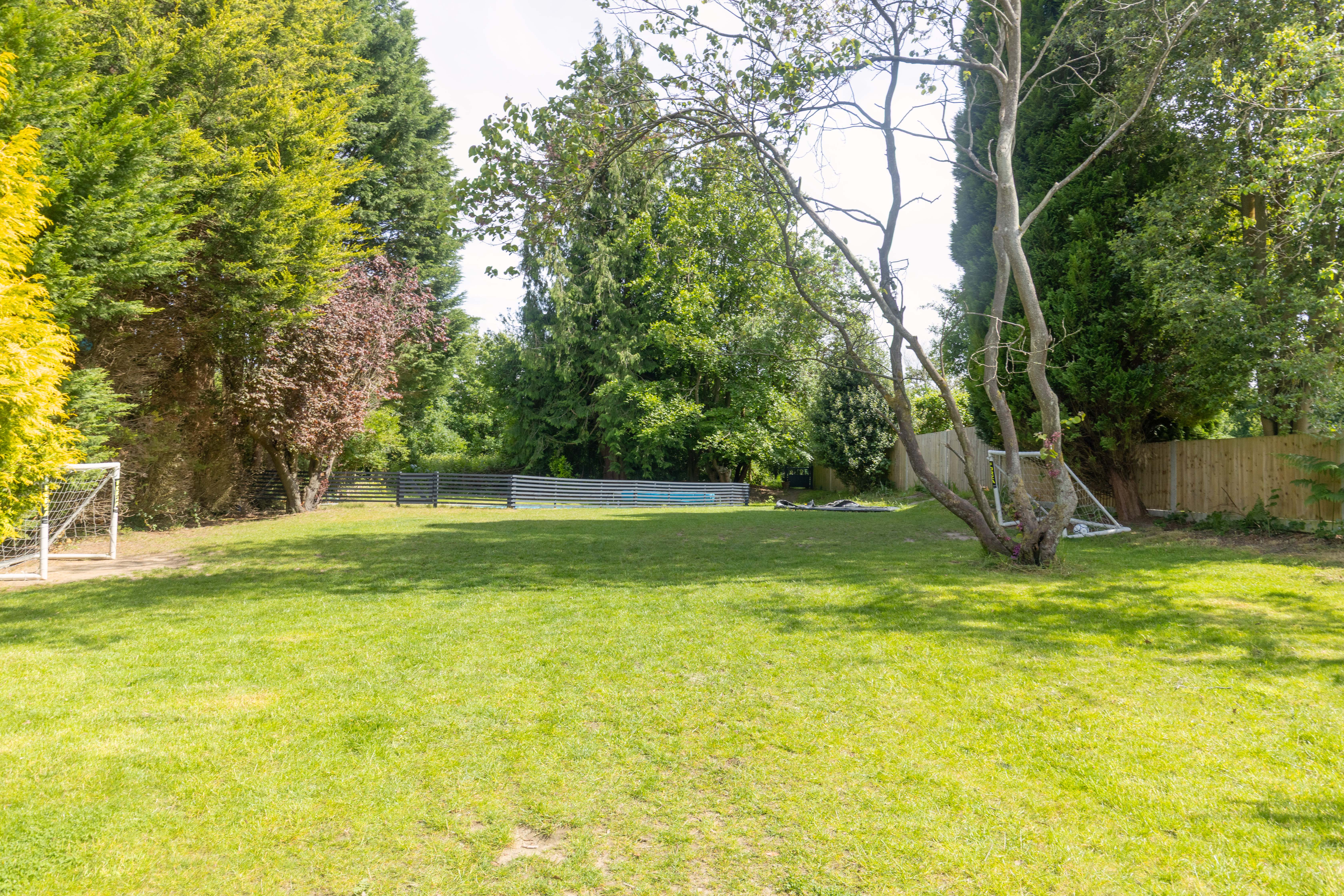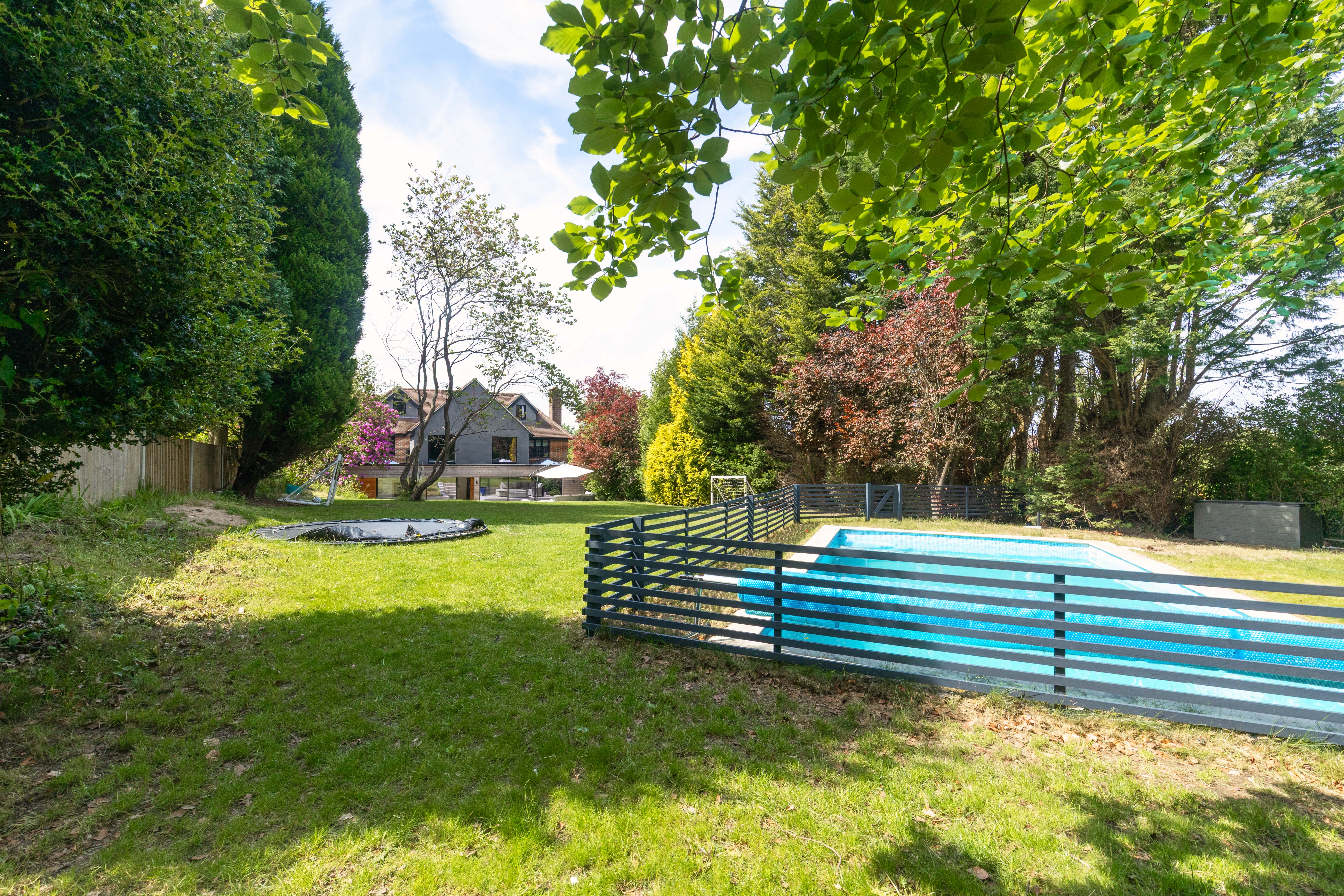 Large, sunny rear garden approximately 1/3 acre, including an outdoor swimming pool.