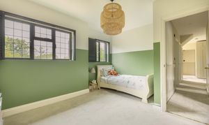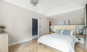 Upstairs, the vaulted principal suite offers stunning garden views, a walk-in wardrobe, and a luxurious en-suite with freestanding bath, large walk-in shower, and bespoke wooden detailing. Three further double bedrooms and two stylish bathrooms (one with twin basins and bath, one with a walk-in shower) complete the first floor. The second floor offers excellent flexibility, currently arranged as a guest or teen suite with a double bedroom, study (potential sixth bedroom), and wet room. These rooms sit partially within the eaves and benefit from excellent storage. Outside, the south-facing rear garden is a real highlight. With a large lawn, sheltered patio, and additional paved seating areas ideal for summer barbecues, it’s a wonderful space for families. Mature trees and hedging offer privacy, while a picket fence encloses the rear section where a private swimming pool provides the perfect spot for fitness or fun. This is a truly outstanding family home, offering comfort, style, and space in equal measure. High-end finishes, bespoke cabinetry, underfloor heating, and a thoughtful layout combine to make this property a rare find and a joy to live in.