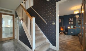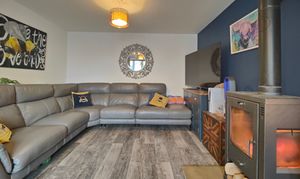 Your home features thoughtfully designed living spaces flooded with natural light, complemented by a fully fitted, high-specification kitchen. The sleek kitchen cabinets with concealed handles and soft-closing doors and drawers provide both elegance and practicality, whilst integrated Neff appliances including fridge/freezer, dishwasher, electric oven, and hob make meal preparation a pleasure. Karndean flooring through the welcoming hallway, kitchen diner, utility room and cloakroom complements the contemporary wood and glass internal doors. Bi-Folds create the perfect balance of outside, inside living whilst at the front of the house the separate lounge has a truly traditional feel with a real wood burning stove which is glazed to three sides. High ceilings, unusual in new builds, create a feel of opulent elegance.
