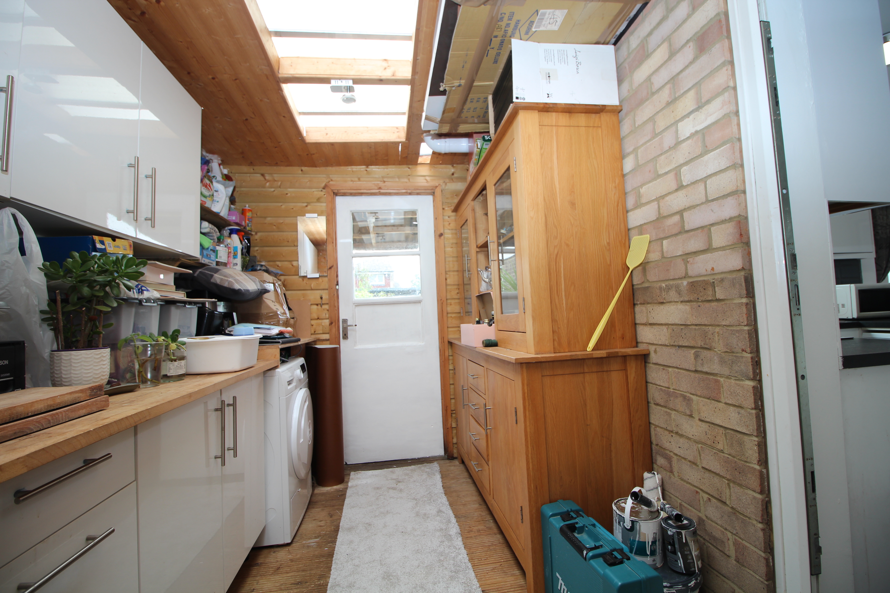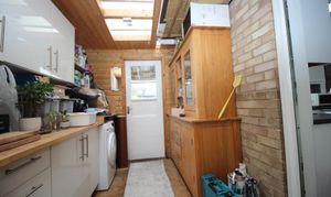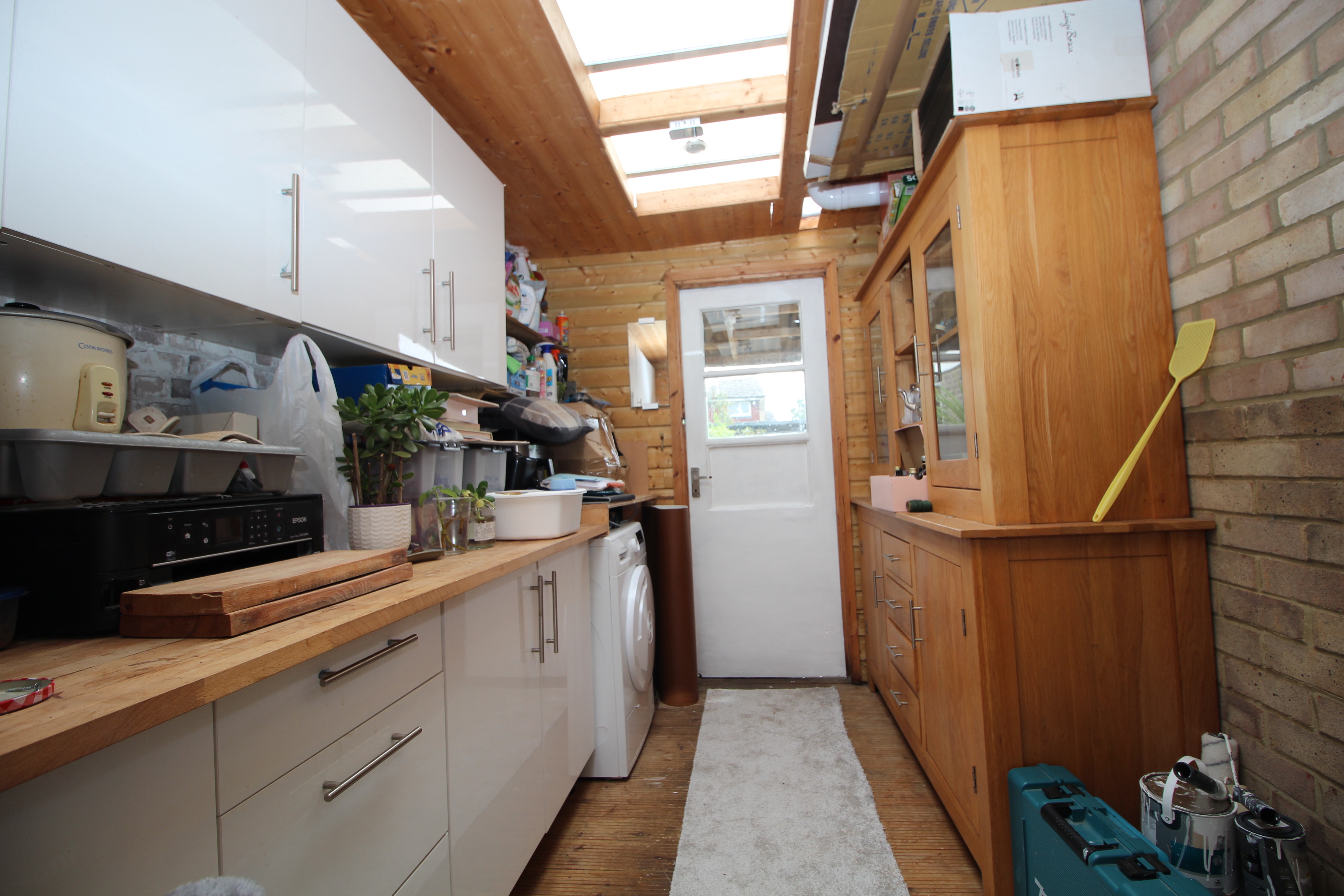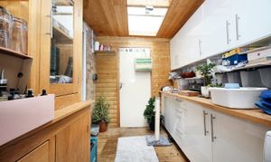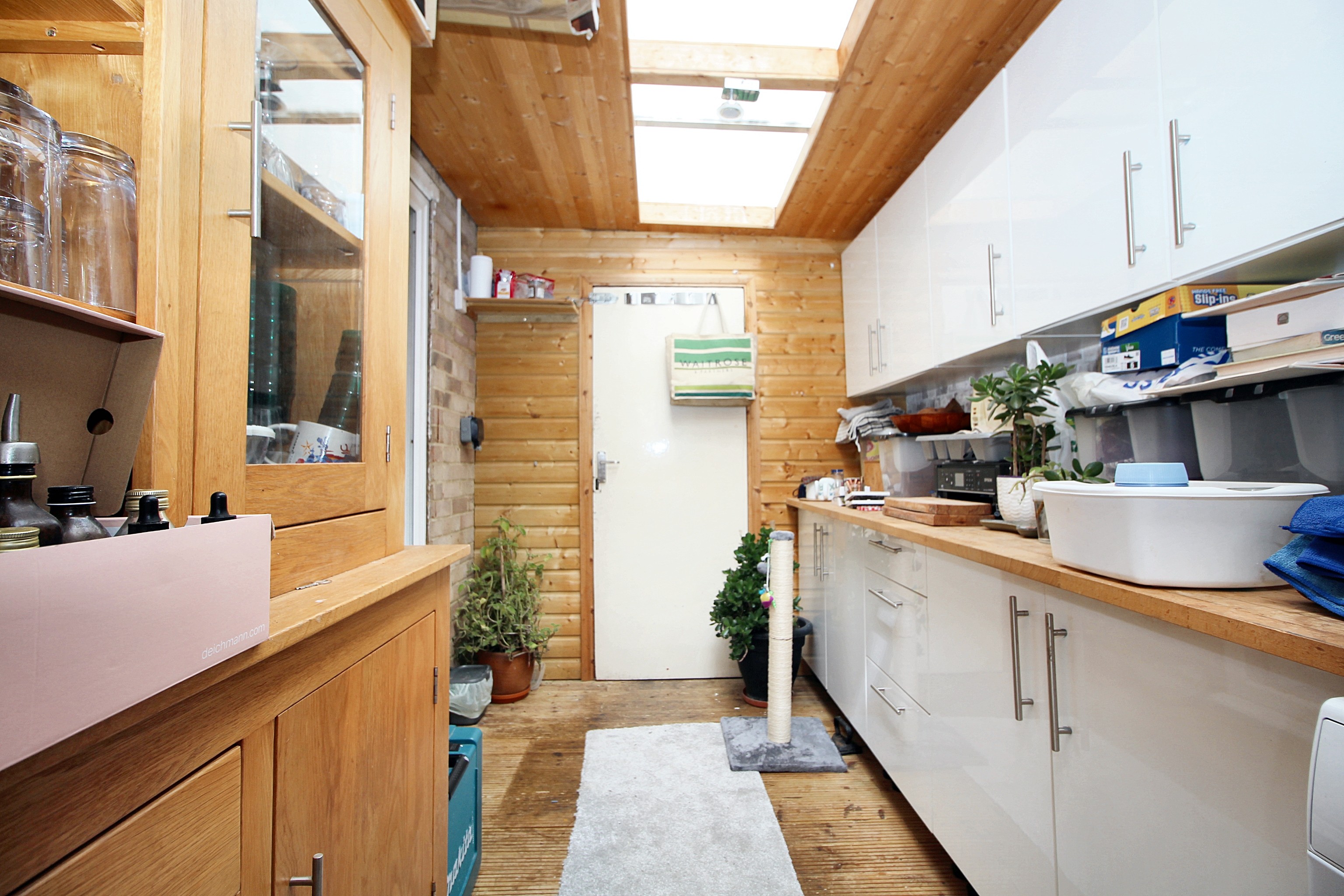 A practical space fitted with wall and base units, wooden worktops, and storage cupboards. The room includes space and plumbing for appliances, skylights providing natural light, and access to the rear.