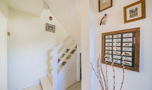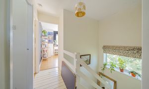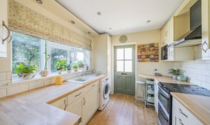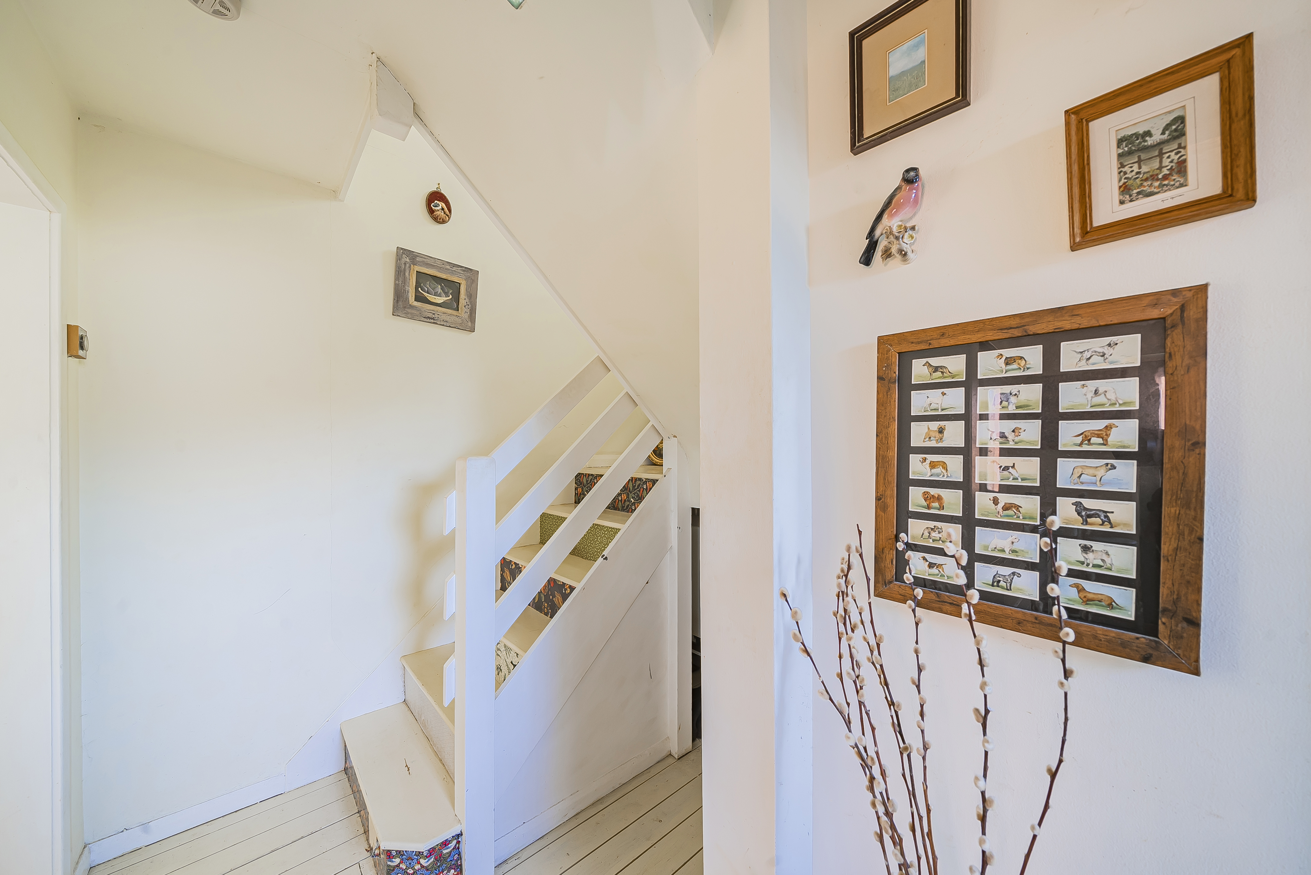 includes a downstairs cloakroom, understairs storage and access to the kitchen on the left. The kitchen is