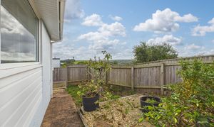 Outside the drive with gates accommodates two parking spaces leading up to the garage. There is a side access from the garage to a covered passageway. The garden wraps around the property, has lovely views and is well fenced in and secure for pets.