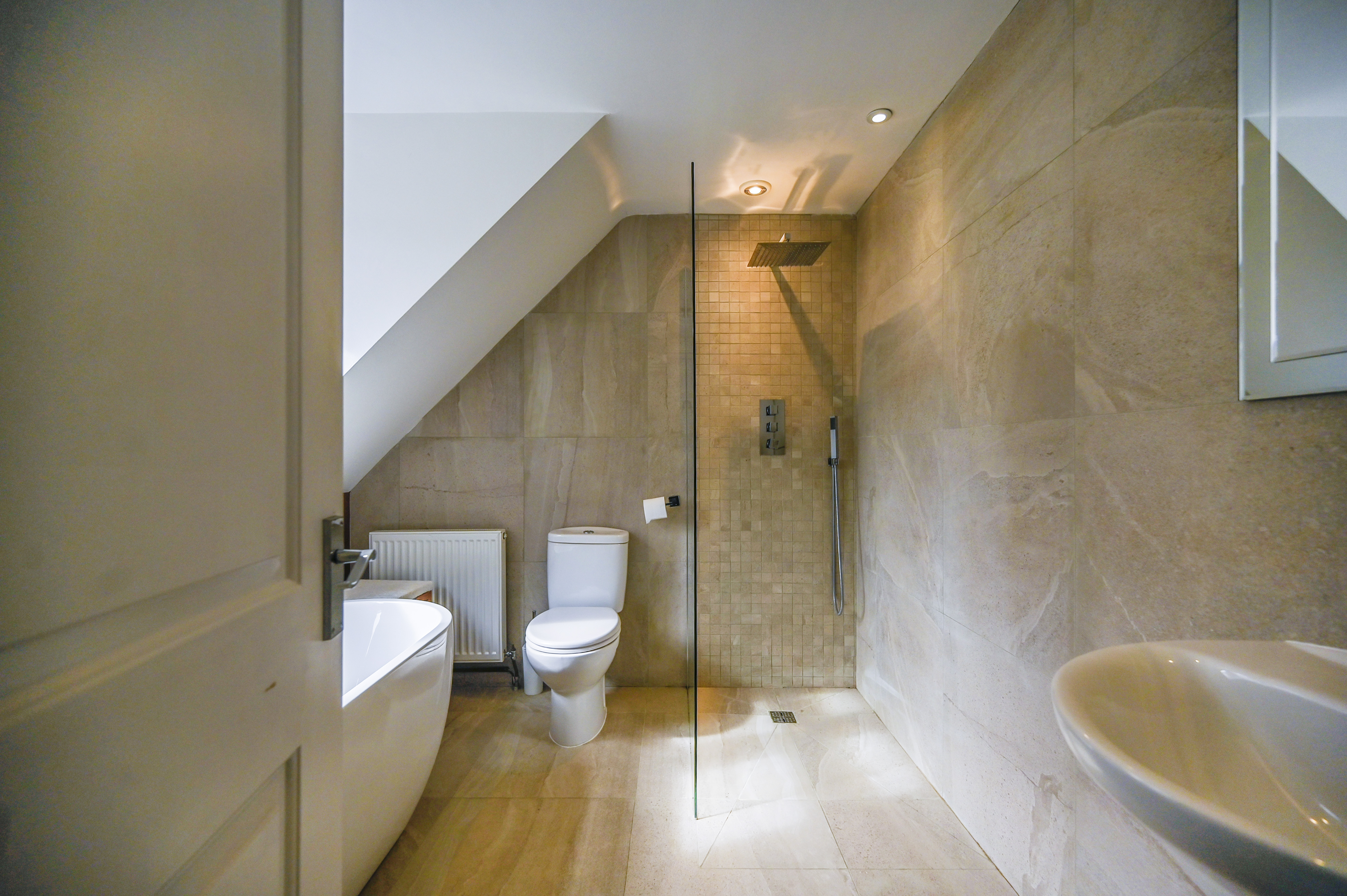 UPVC double glazed dormer window with views to the rear, freestanding bath with walk-in drench shower, closed couple WC, hand basin, beautiful tiled walls with mosaic tiled back wall inside shower area, tiled flooring, heated towel rail, radiator and an extractor fan.