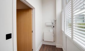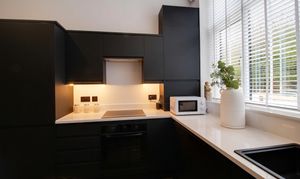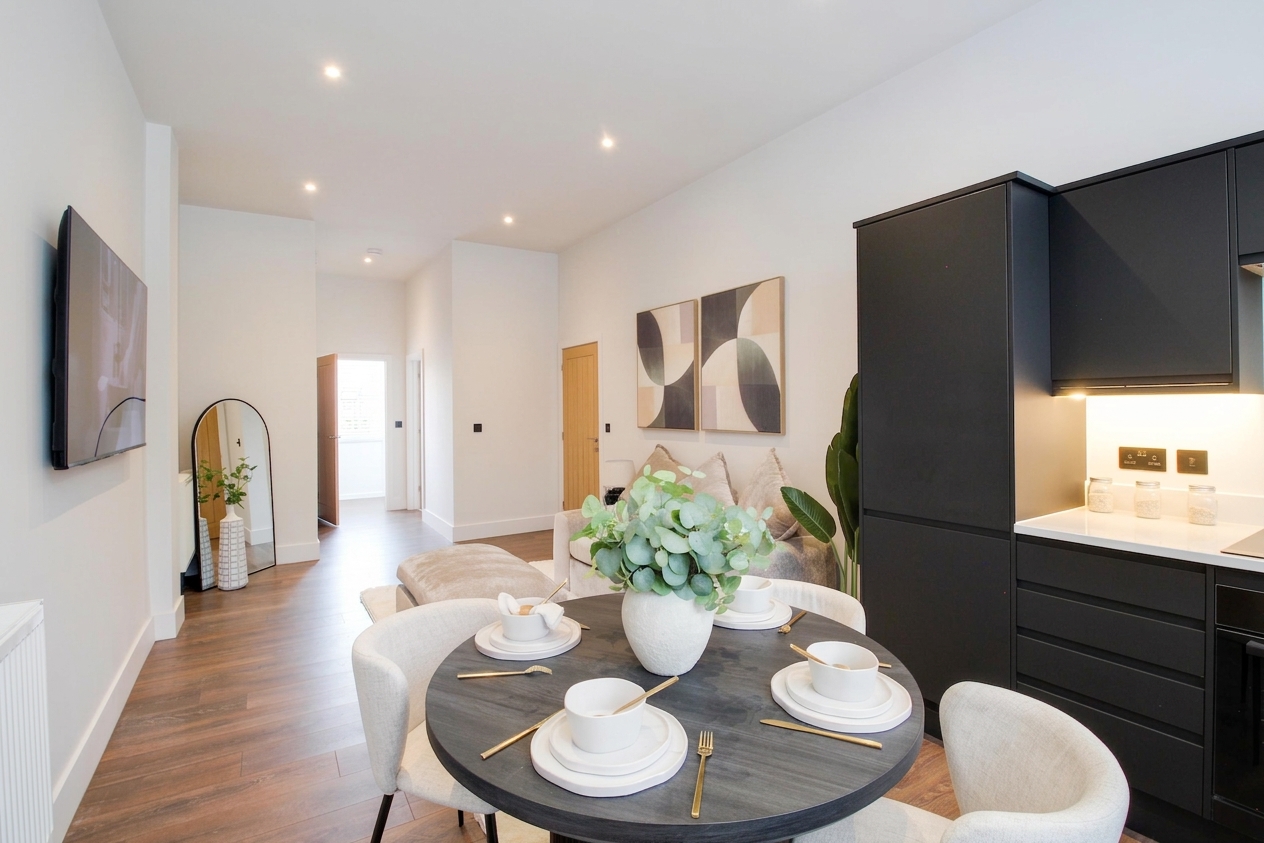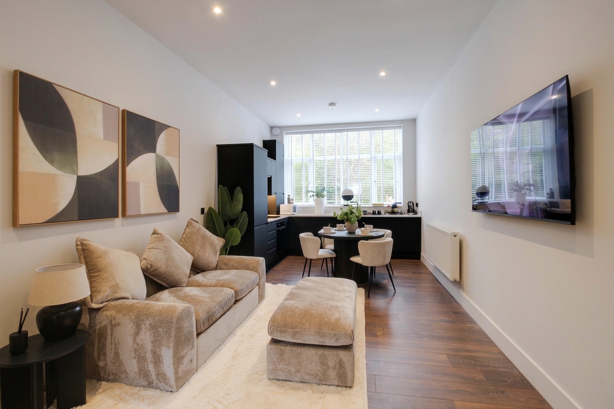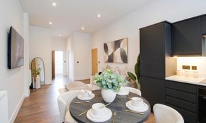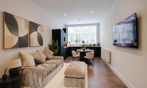 Presenting an exceptional opportunity to move in to a stunning and spacious one bedroom ground floor apartment, this beautifully appointed property combines contemporary design with practical features to create a truly inviting home. Upon entering, you are welcomed into a bright and airy open plan living area, enhanced by impressive high ceilings that contribute to the sense of space and elegance. The living area seamlessly flows into a modern kitchen, which comes fully equipped with integrated appliances (including oven, hob, fridge freezer, dishwasher & washing machine), offering both convenience and style for every-day living and entertaining. The luxurious finish throughout the apartment is evident in the choice of high quality materials, fixtures, and fittings, ensuring a sophisticated yet comfortable atmosphere. The generous double bedroom benefits from ample space for storage and relaxation, while the well-appointed bathroom features sleek contemporary sanitaryware and tasteful tiling, providing a tranquil retreat for unwinding at the end of the day.