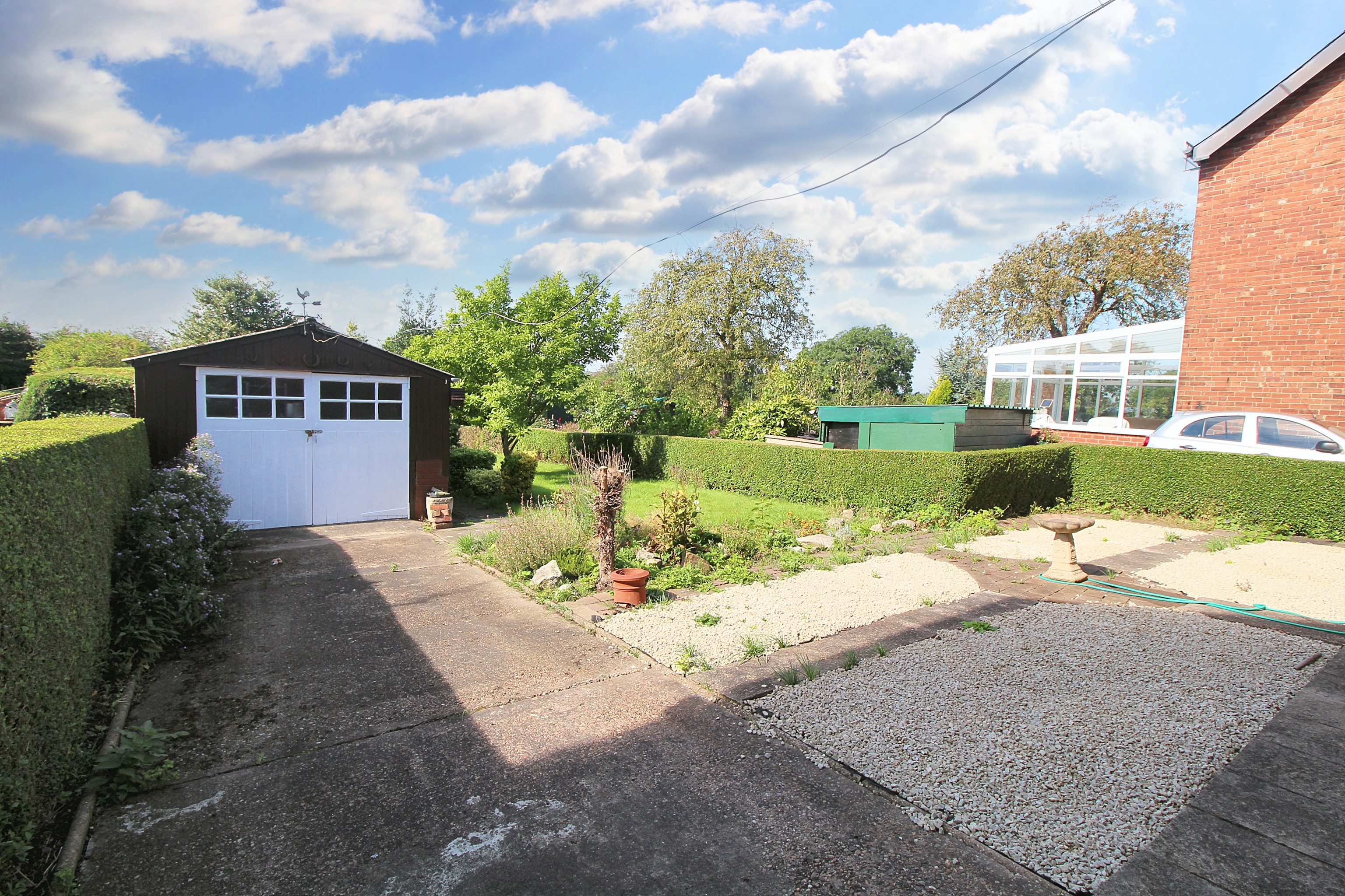 The boundary wall to the front has a single pedestrian gate and double gates to the driveway. It has paved areas with borders to the front. Then the driveway leads to the single garage, which has a brick built potting shed located to the rear. There are generous gardens and will require a keen gardener to maintain these well stocked gardens with lawn to the middle and shrubs plus trees.