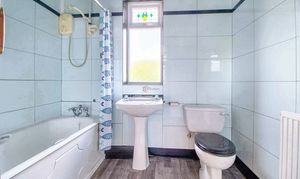 This traditional bathroom is fully tiled with a white bath and shower over, wash hand basin and WC.