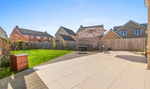 Externally, the property occupies a generous plot. To the front, there is a large lawned area along with ample parking leading to a detached double garage. The rear garden enjoys a desirable south-facing aspect and has been beautifully landscaped to create a relaxing and private outdoor space, featuring a spacious patio, decking, and seating areas—perfect for entertaining or unwinding in the warmer months.