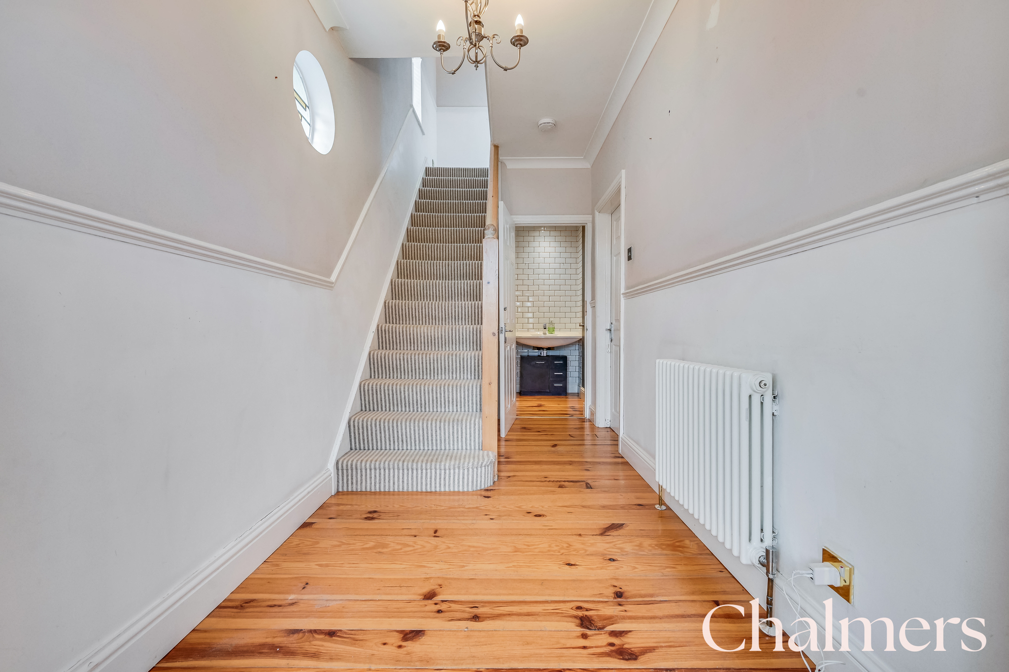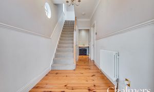 Stained glass feature window to side aspect, access to downstairs WC, column style radiator, ceiling rose, coving, dado rail, skirting, wooden floorboards and a carpeted staircase rising to the first floor landing with storage cupboards underneath.