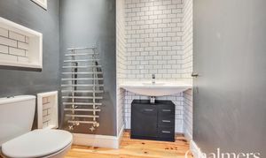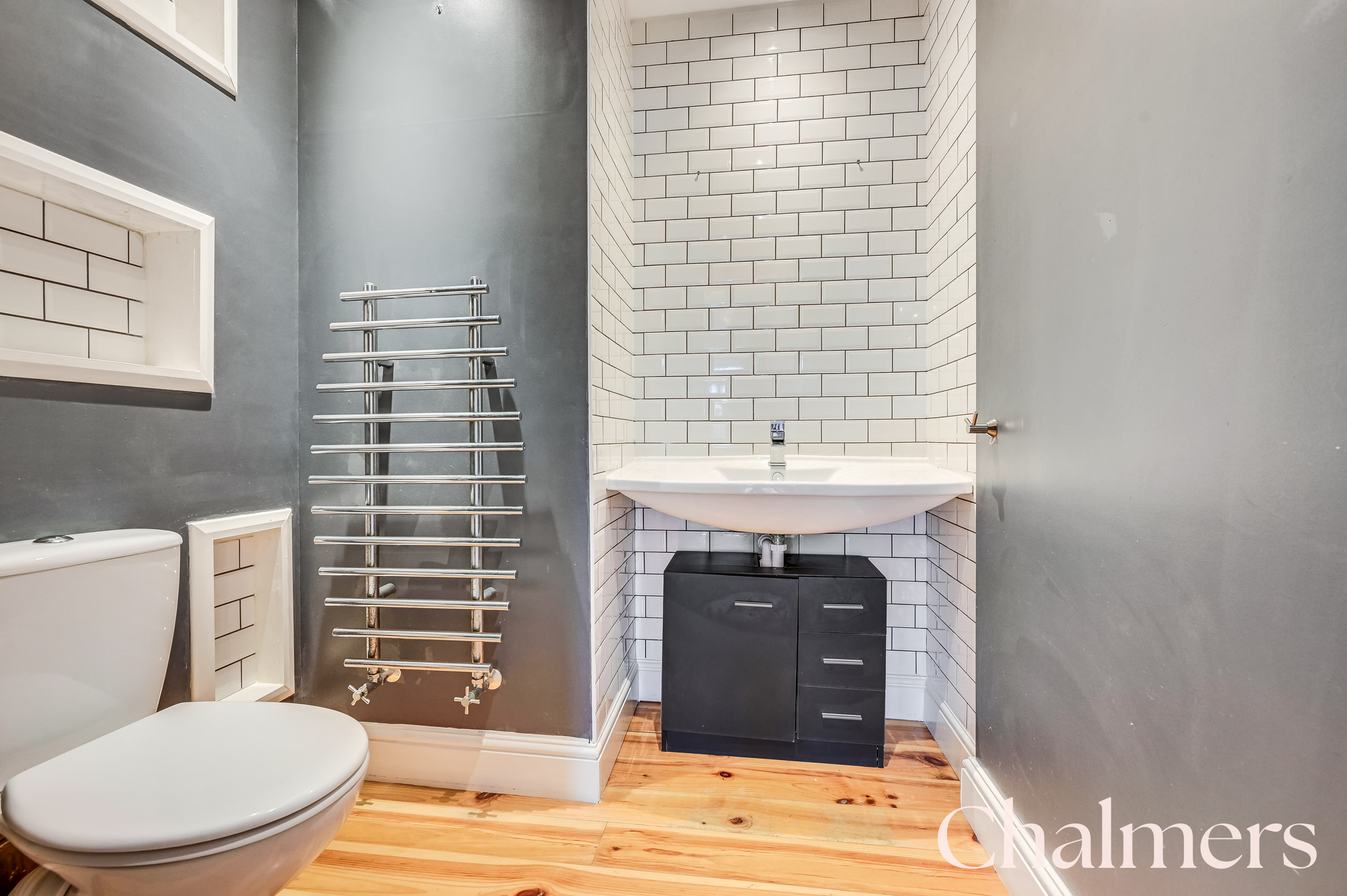 Wall-mounted wash basin with chrome mixer tap, inset shelving, chrome towel radiator, WC, extractor fan, spotlights, partial wall tiling, skirting and original wooden floorboards.