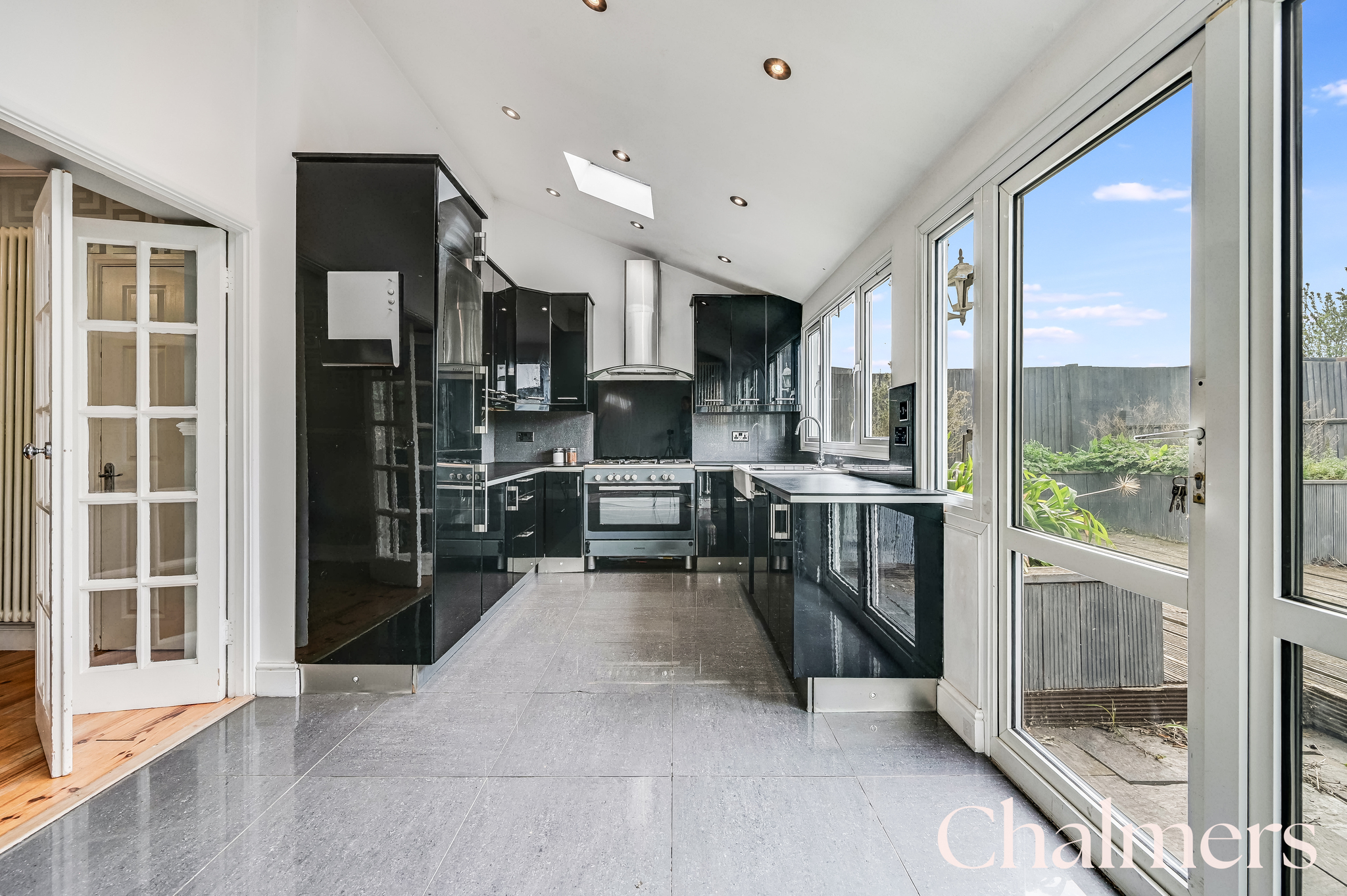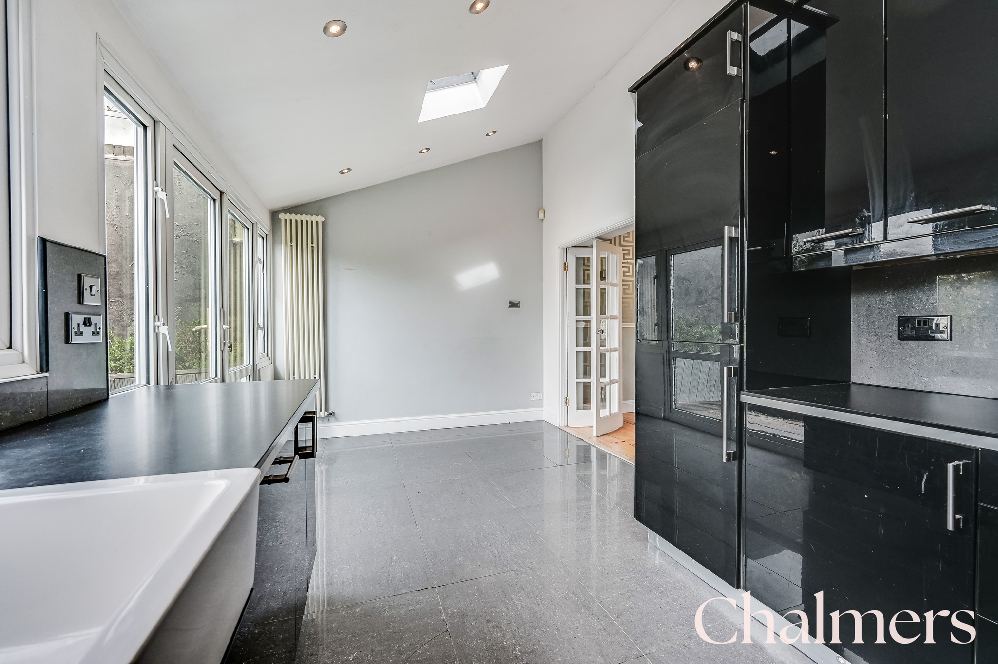 Double glazed French doors and sidelights for garden access as well as a double glazed rear window and two opening skylights. Gloss kitchen units both wall-mounted and base level comprising; double butler sink with chrome mixer tap, integrated dishwasher, integrated fridge/freezer, five ring burner stainless steel cooker to remain with extractor hood over, laminate worktops, spotlighting, modern vertical column style radiator, skirting and a tiled floor.
