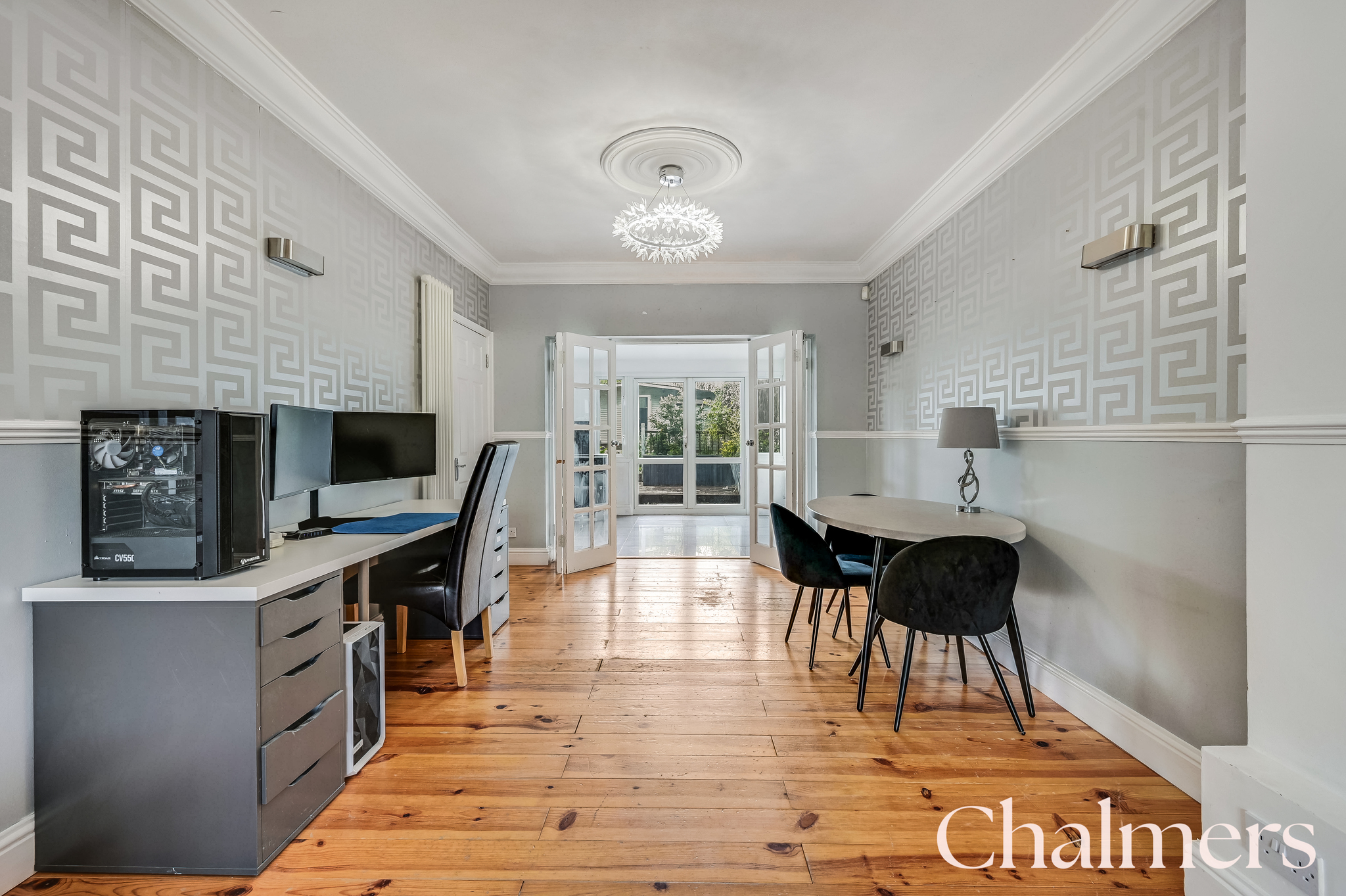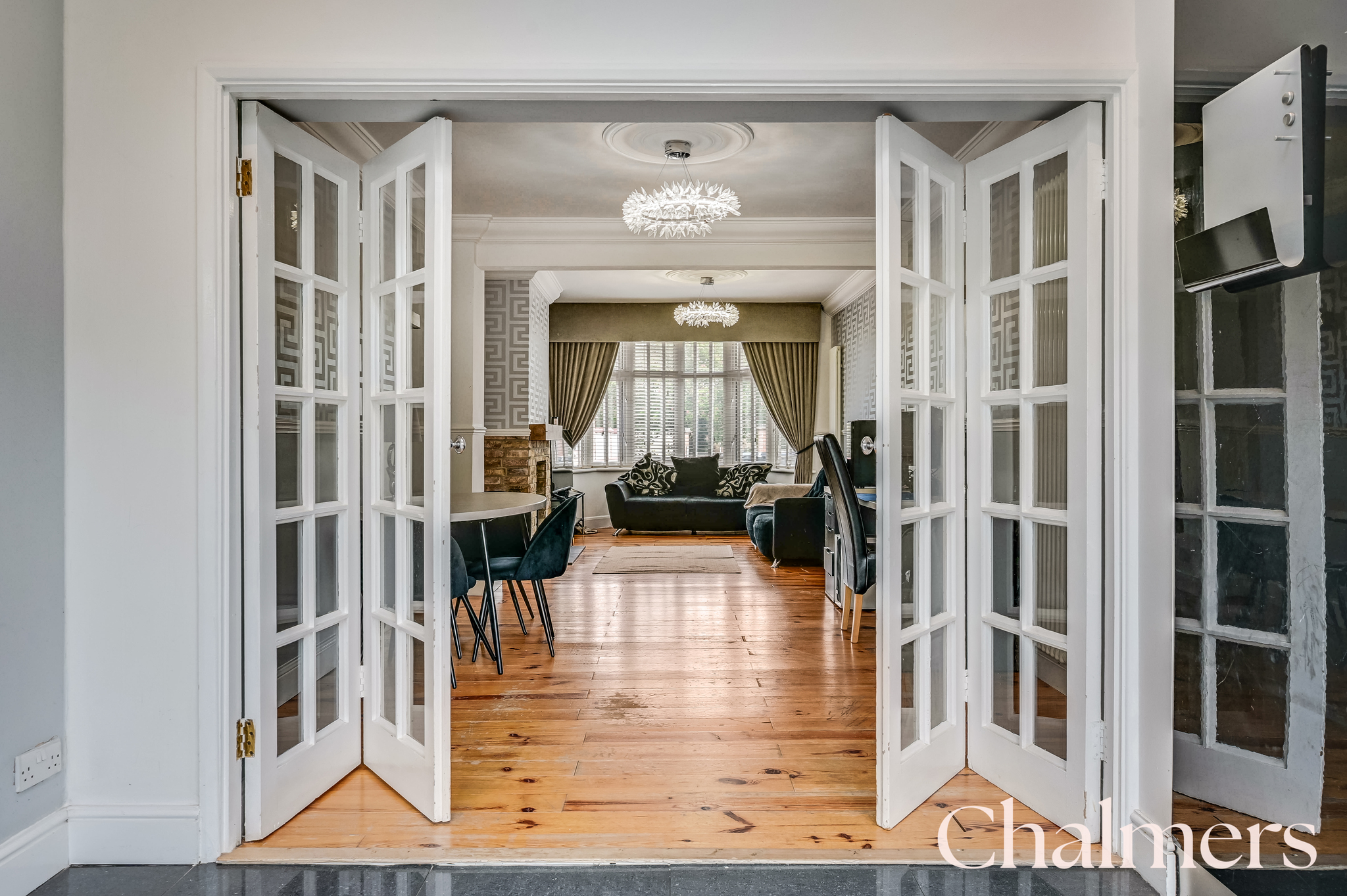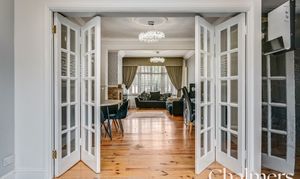 Concertina doors lead from the kitchen into the dining room area, wooden floorboards, ceiling rose, dado rails, column radiator.