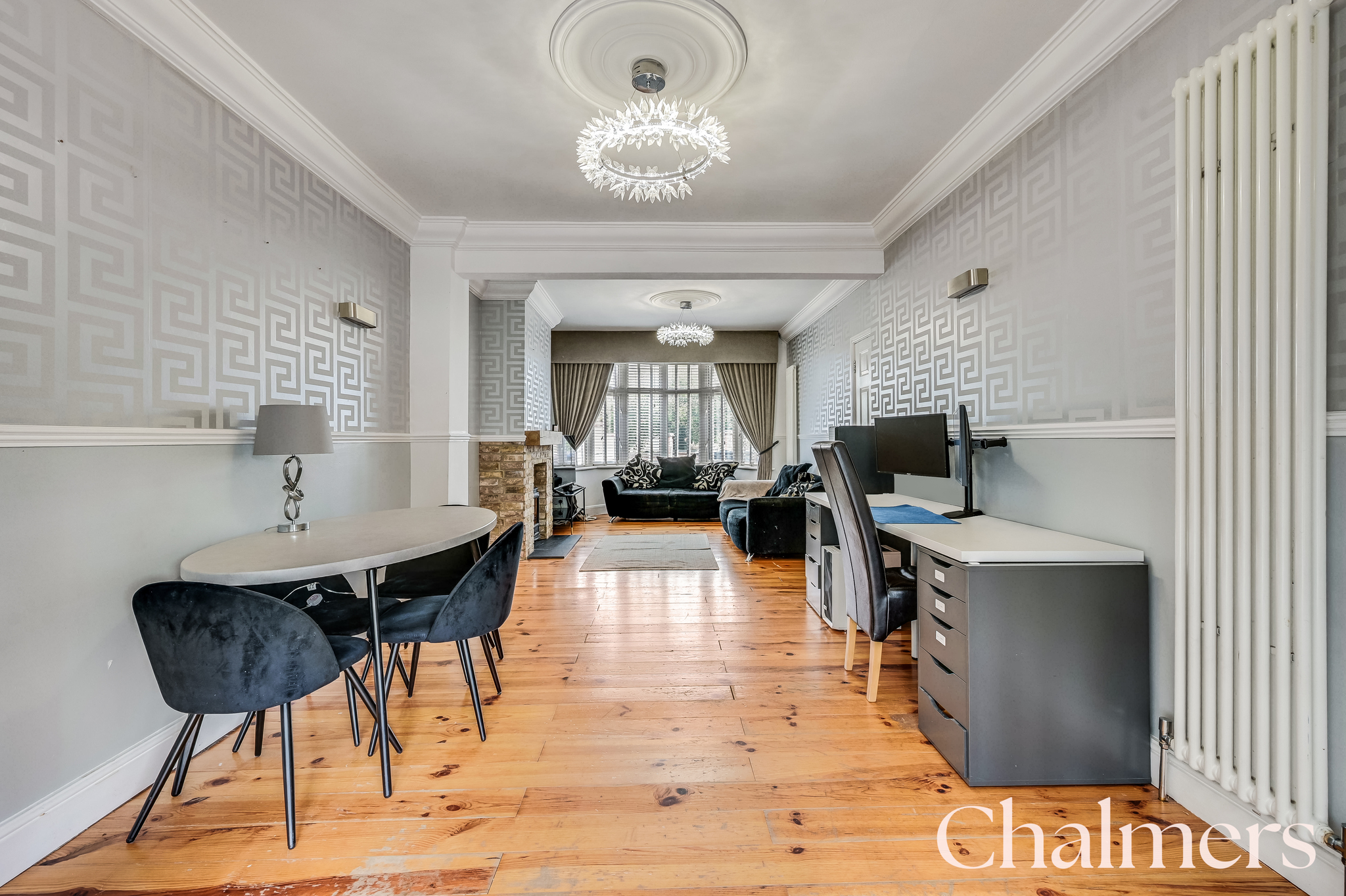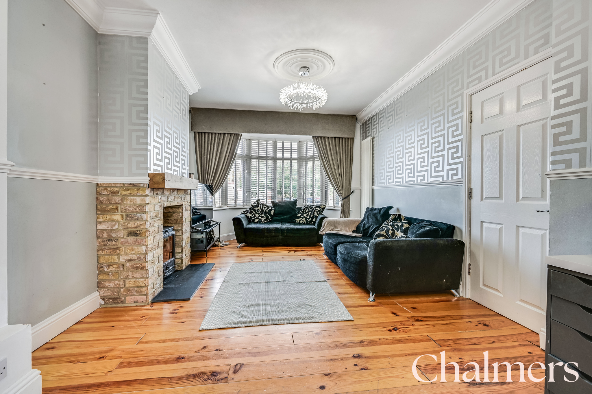 UPVC double glazed bay fronted window room, feature fireplace with log burning stove, ceiling roses and cornice, dado rail, skirting and original wooden floorboards.