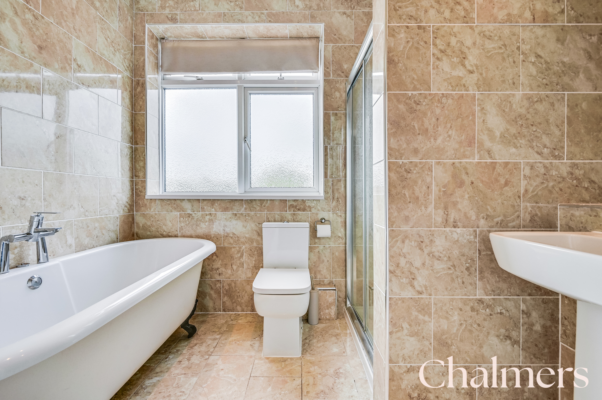 Obscured UPVC double glazed rear window, shower cubicle with extractor fan, pedestal wash basin with chrome mixer tap, traditionally styled freestanding bath, WC, chrome towel radiator, spotlighting, fully tiled walls and flooring.