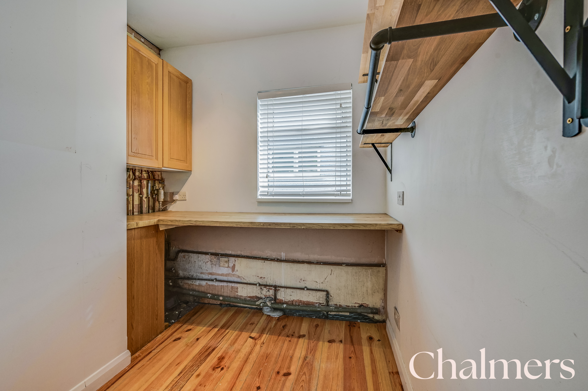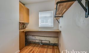 UPVC double glazed side window, wall-mounted boiler in cupboard, laminate worktops, skirting and wooden floorboards.