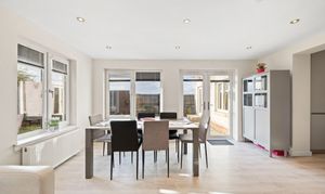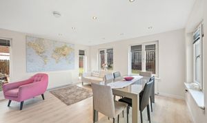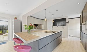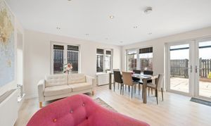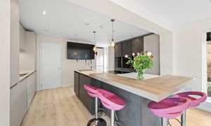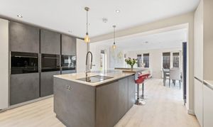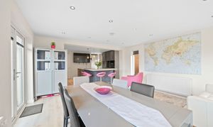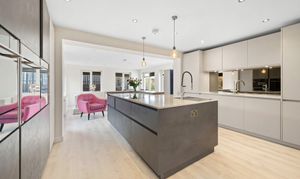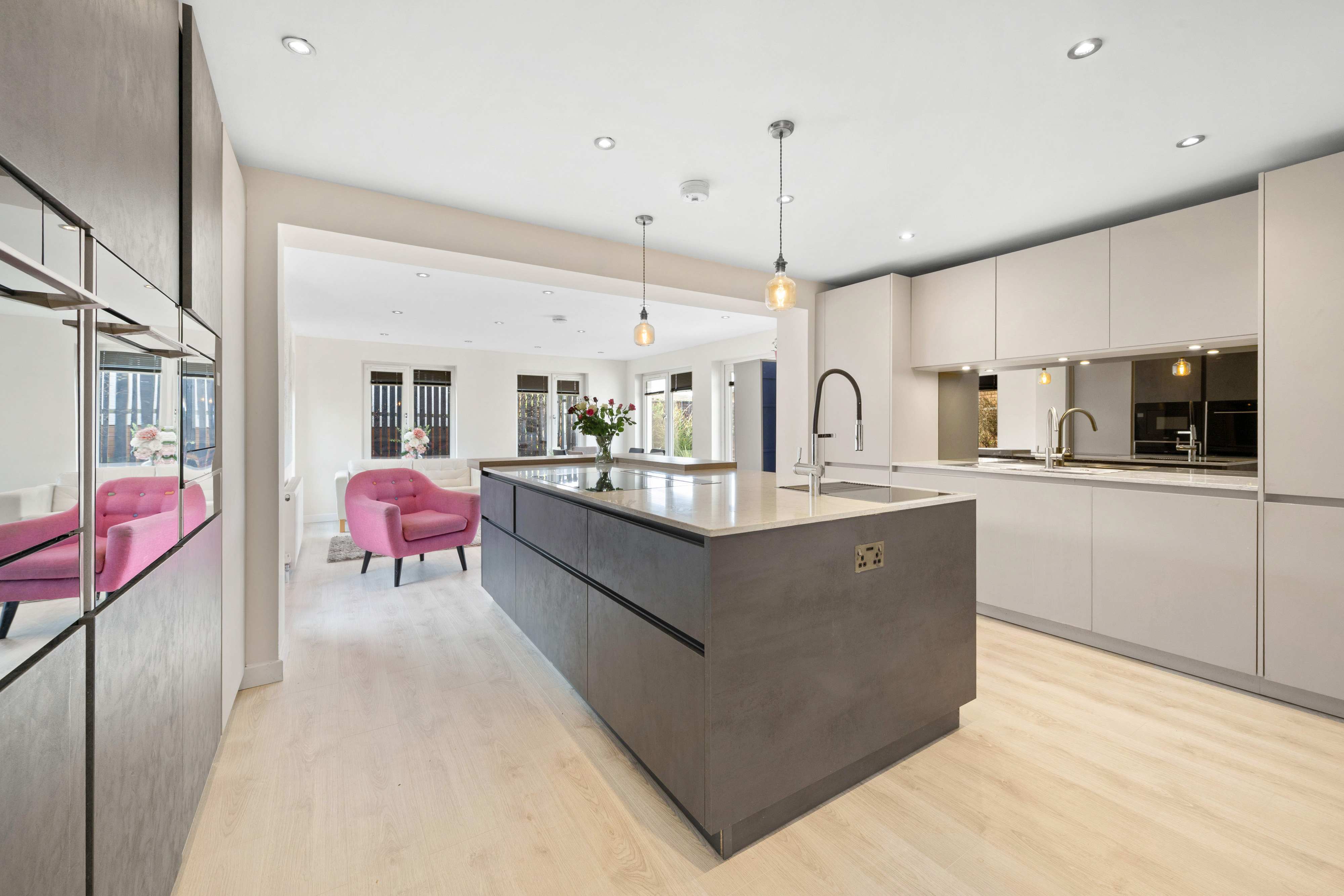 To the rear of the property lies the heart of the home, the expansive open plan kitchen and dining area forming part of the rear extension. This impressive space is designed for modern family living and entertaining, featuring dark grey cabinetry, generous worktop space and a large central island. The kitchen includes integrated appliances such as ovens, fridge, freezer, dishwasher and cooker. The dining area comfortably accommodates eight to ten people and is surrounded by windows and patio doors that lead directly to the south facing rear garden, allowing natural light to flood the space.