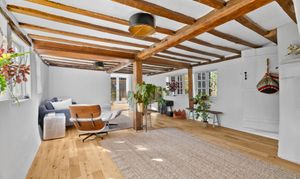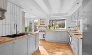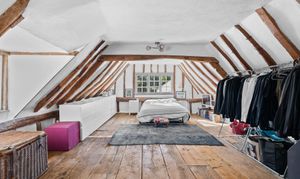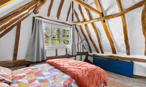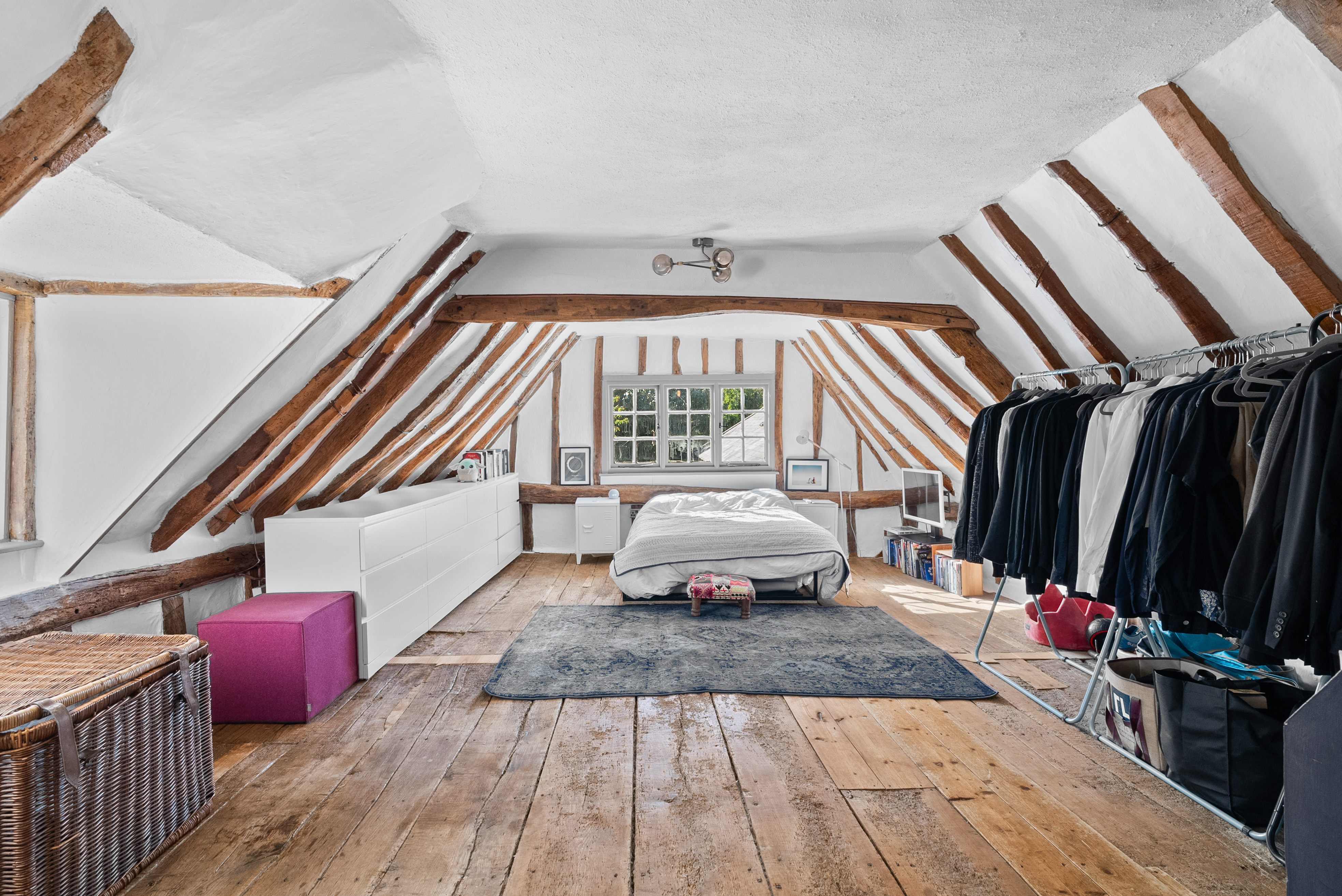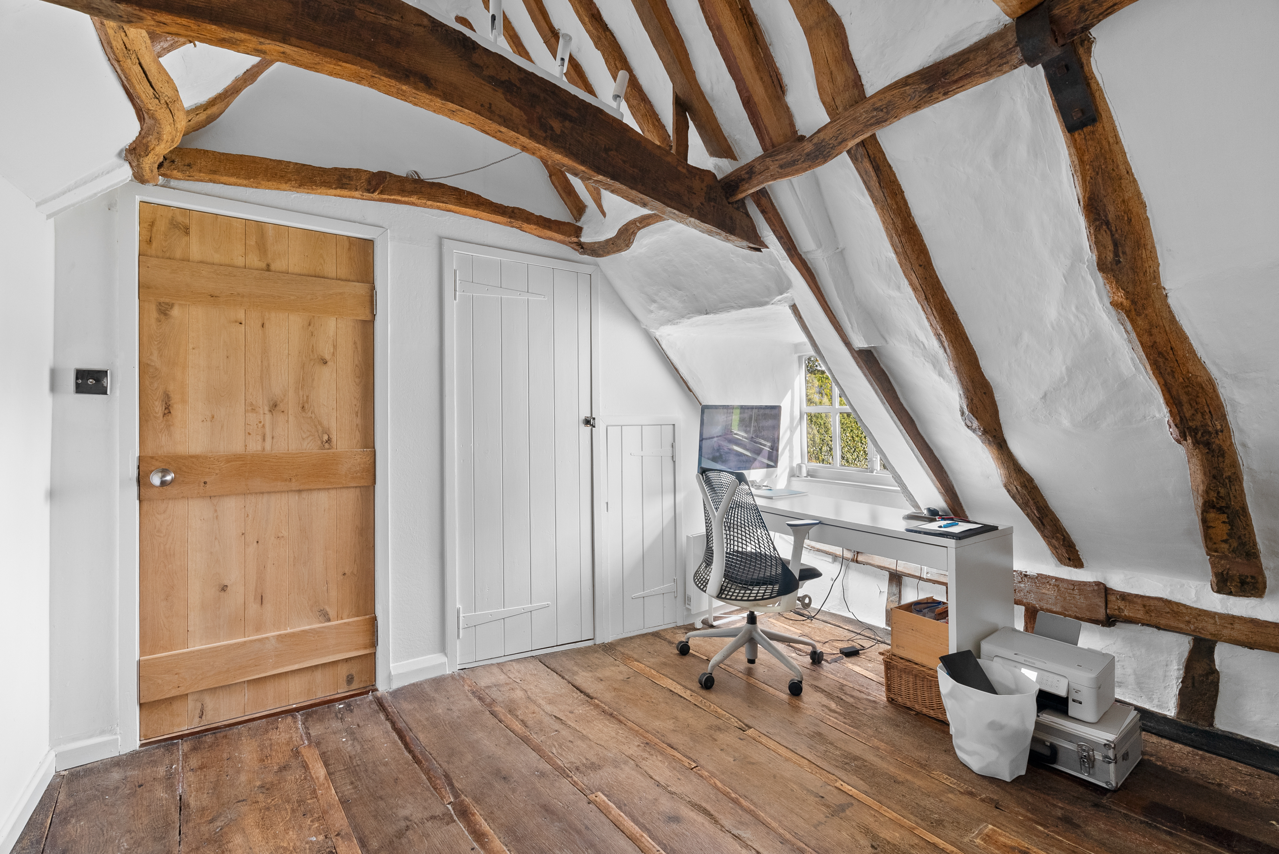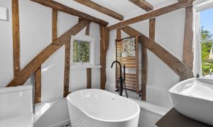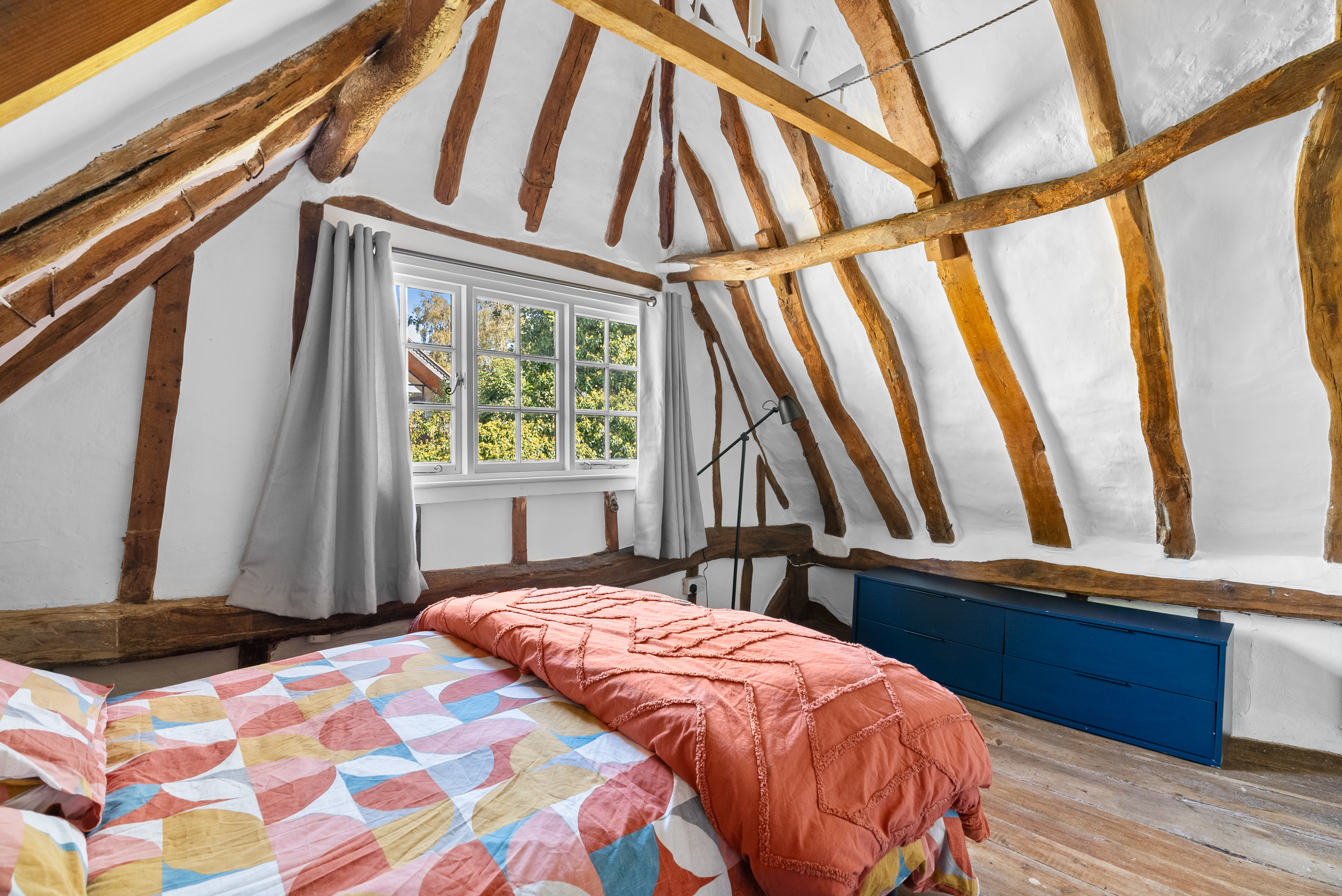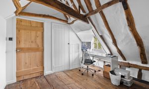 Upstairs, the property continues to impress with three double bedrooms, each presented to the same flawless standard. All rooms enjoy vaulted ceilings, exposed beams and original wide oak floorboards, creating a sense of history blended with understated elegance. Bedroom one is accessed via stairs from the sitting room, while bedrooms two and three are reached by stairs from the family room.