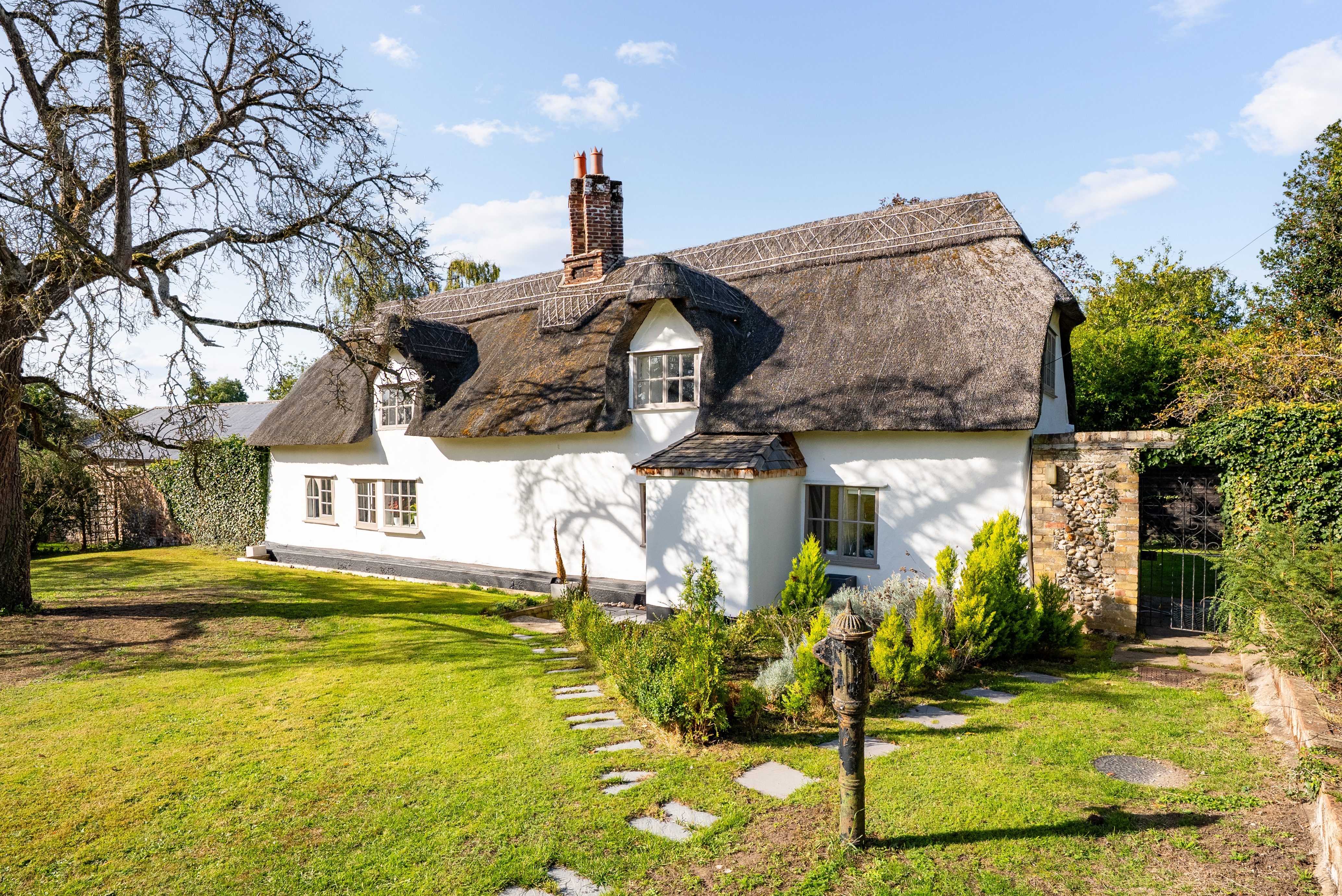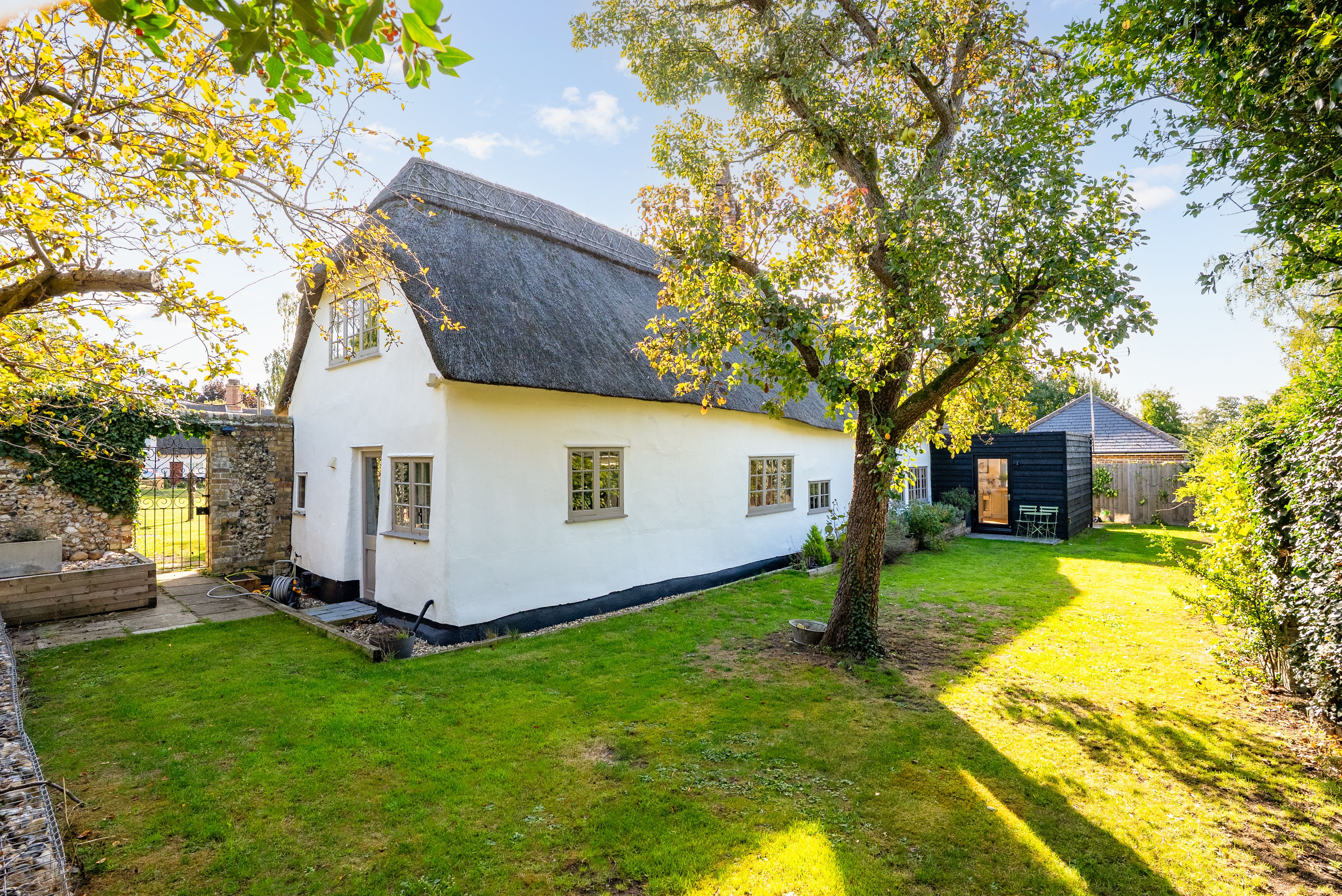 Outside, the property sits within generous mature gardens of approximately 0.28 acres, which include the former village green, once the site of a medieval market. A gravel driveway provides parking for at least two vehicles and leads to a garage with up-and-over door. The expansive front garden is mainly laid to lawn with raised beds, and newly planted laurel hedging will in time provide complete enclosure. A flint wall with wrought iron gate leads to the side and rear gardens, which are beautifully laid out with lawns, well-stocked beds, mature shrubs, specimen and fruit trees. A paved terrace offers the perfect setting for alfresco dining, while a further southerly terrace kitchen garden provides an ideal spot for growing herbs and vegetables.