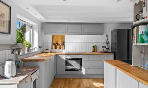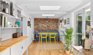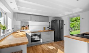 The heart of the home is the bright and spacious kitchen/dining room, fitted with bespoke cabinetry, solid wood work surfaces, inset sink with mixer tap and drainer, four-ring induction hob, oven, extractor and integrated dishwasher, with further space for an American-style fridge/freezer. The room is finished with solid oak flooring and a striking exposed brick wall, and enjoys direct access to both the rear garden and a side kitchen garden. A well-planned utility room complements this space, complete with additional cabinetry, solid wood work surfaces, inset sink, integrated washer/dryer and wall-mounted boiler. The ground floor bathroom has been luxuriously refitted with a walk-in shower, contemporary freestanding bath, vanity basin and low-level WC, all enhanced by stylish matt black fittings, quality tiling and a heated towel rail.