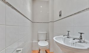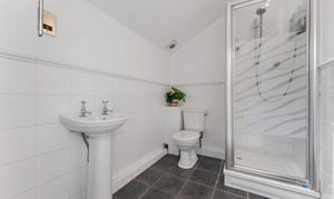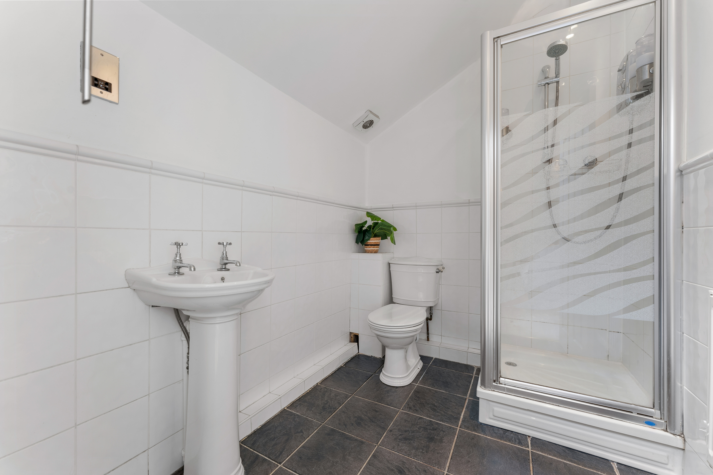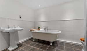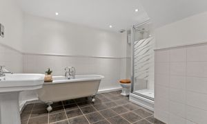 Serving this level is a generous family bathroom, combining classic elegance with modern practicality. A freestanding claw-foot bath offers a touch of luxury for long soaks, while the separate shower enclosure ensures convenience for everyday family routines. Spacious and versatile, it is perfectly designed to meet the needs of a busy household.