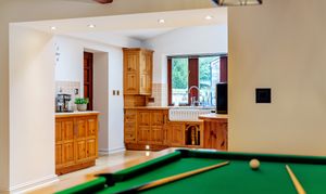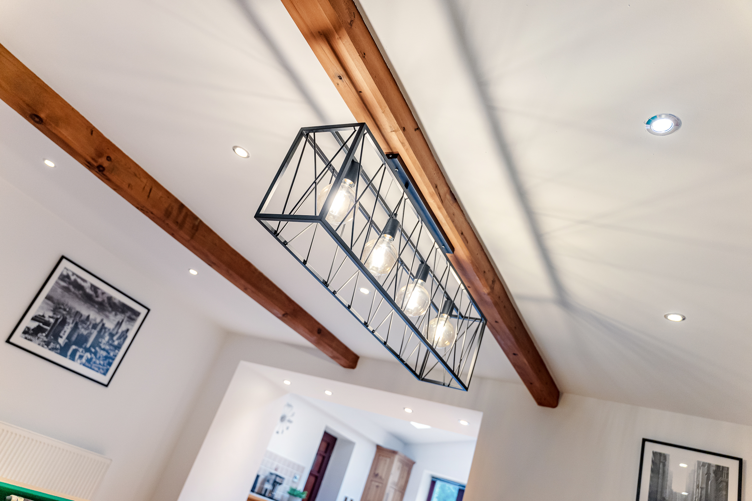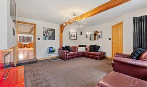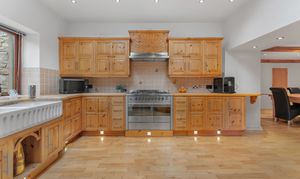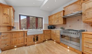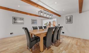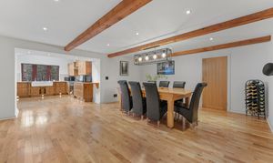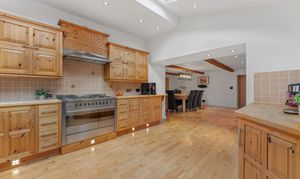 At the centre of the property lies a generous open-plan kitchen and dining room, a space designed for family life and entertaining. Solid wood floors, a bespoke timber kitchen and rustic beams overhead create warmth and character, while the layout provides plenty of room for both dining and lounge areas. Over the years, it has been the perfect backdrop for lively gatherings and relaxed evenings alike. The kitchen blends style with practicality, offering an AEG dishwasher, Indesit washer/dryer, Westinghouse fridge and freezer, and a range-style oven and hob.