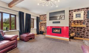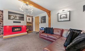 To the front of the house, the living room offers a welcoming retreat. A bespoke media wall frames the Stovax log burner, while exposed beams add to the atmosphere, creating a cosy space for quiet nights in. Subtle wiring for a 5.1 surround sound system and the integration of a Nest thermostat quietly modernise the space, ensuring comfort without disturbing its character. A convenient WC completes the ground floor.