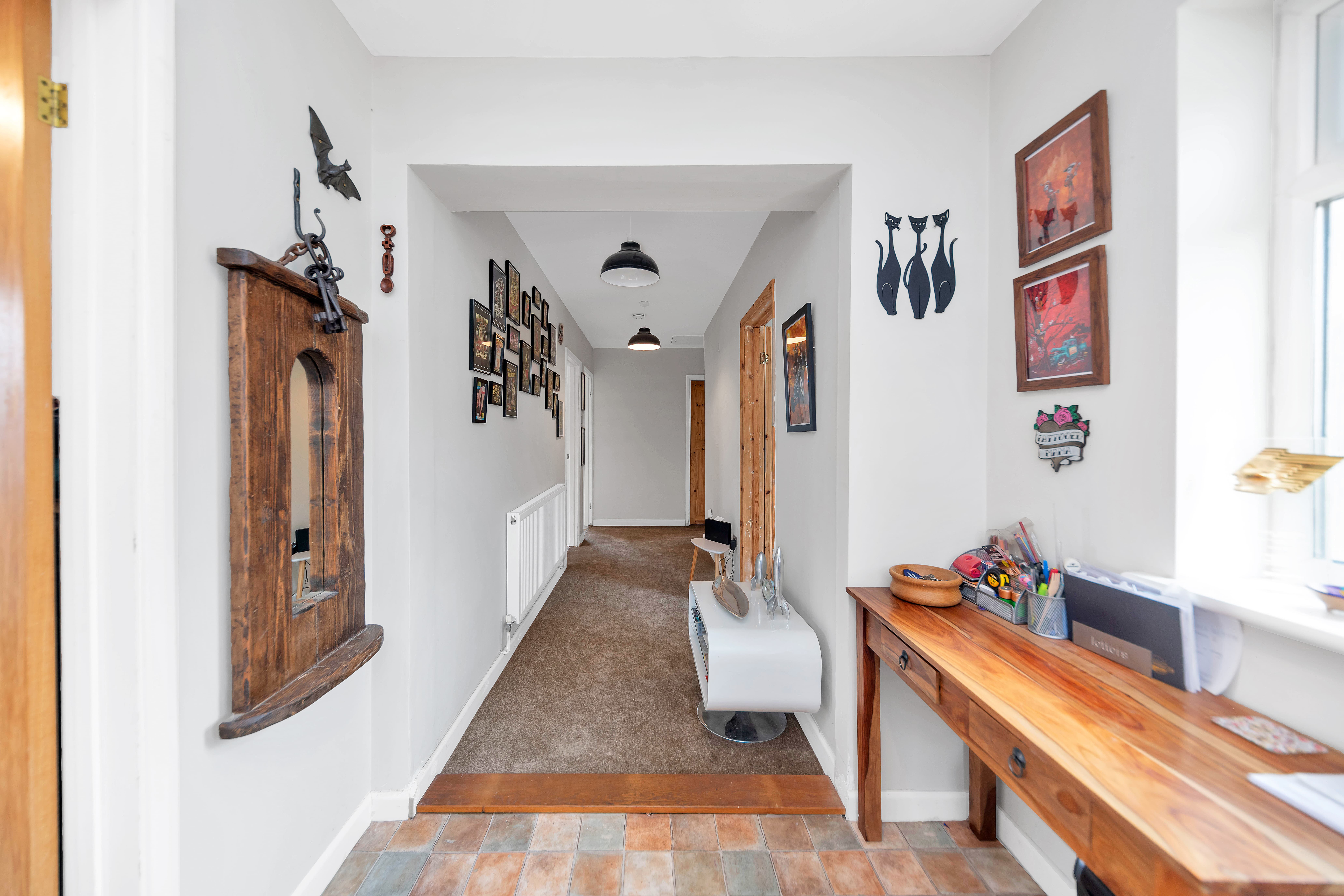 This spacious detached bungalow enjoys a pleasant and tidy frontage, with a front lawn garden, borders of plants and shrubs, space for pots and gated side access to the rear. Upon stepping inside, the entrance hallway is wide and welcoming, with tiled flooring, pendant lighting, room for furniture, and doors through to the entire living space.