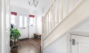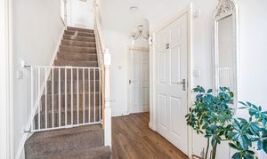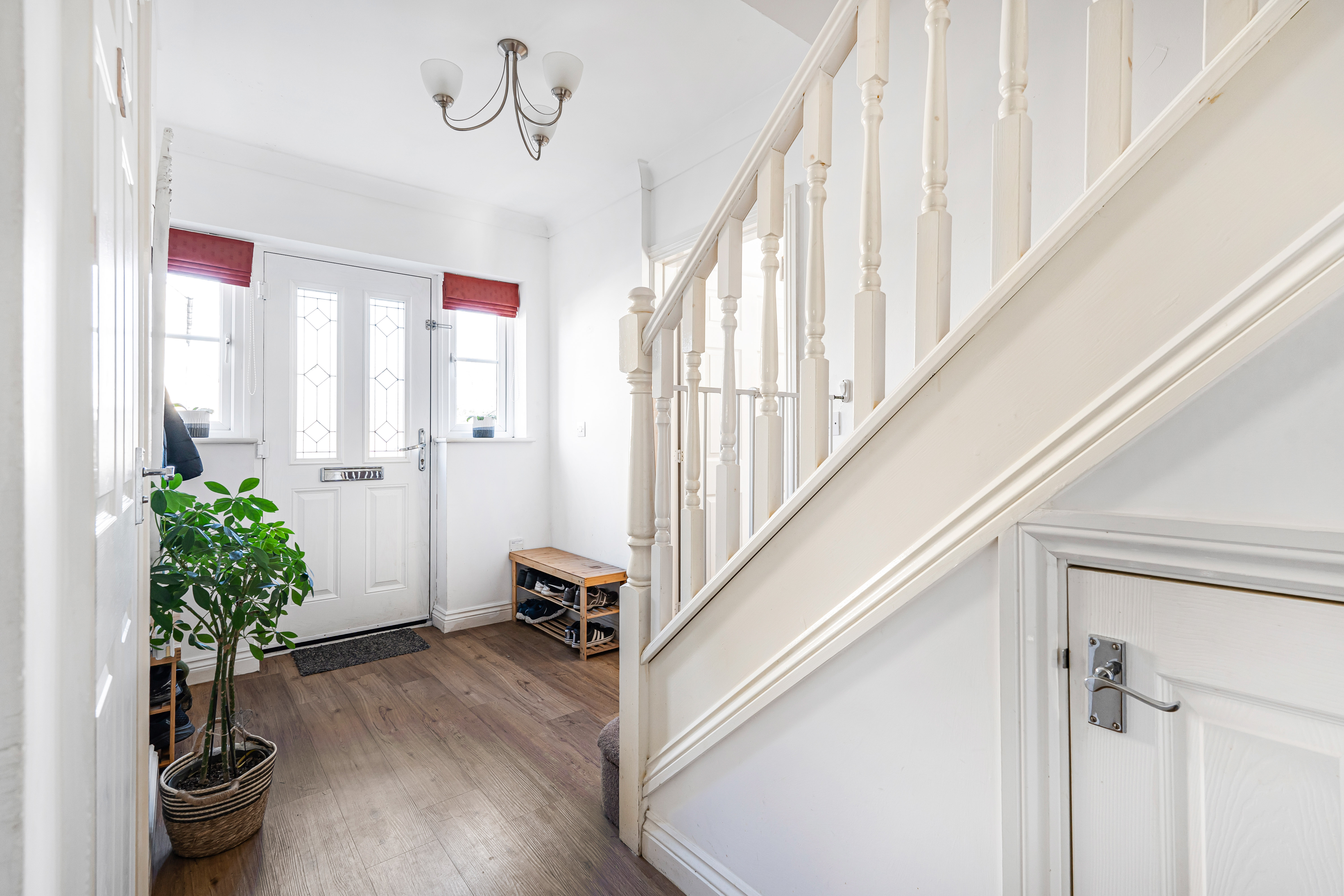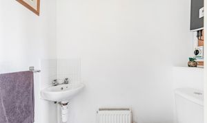 You enter onto the ground floor, with double glazed front door to entrance hall, with wooden style floor, stairs to first floor, under stairs storage cupboard, door into a handy low-level WC, wash hand basin, radiator, extractor fan.