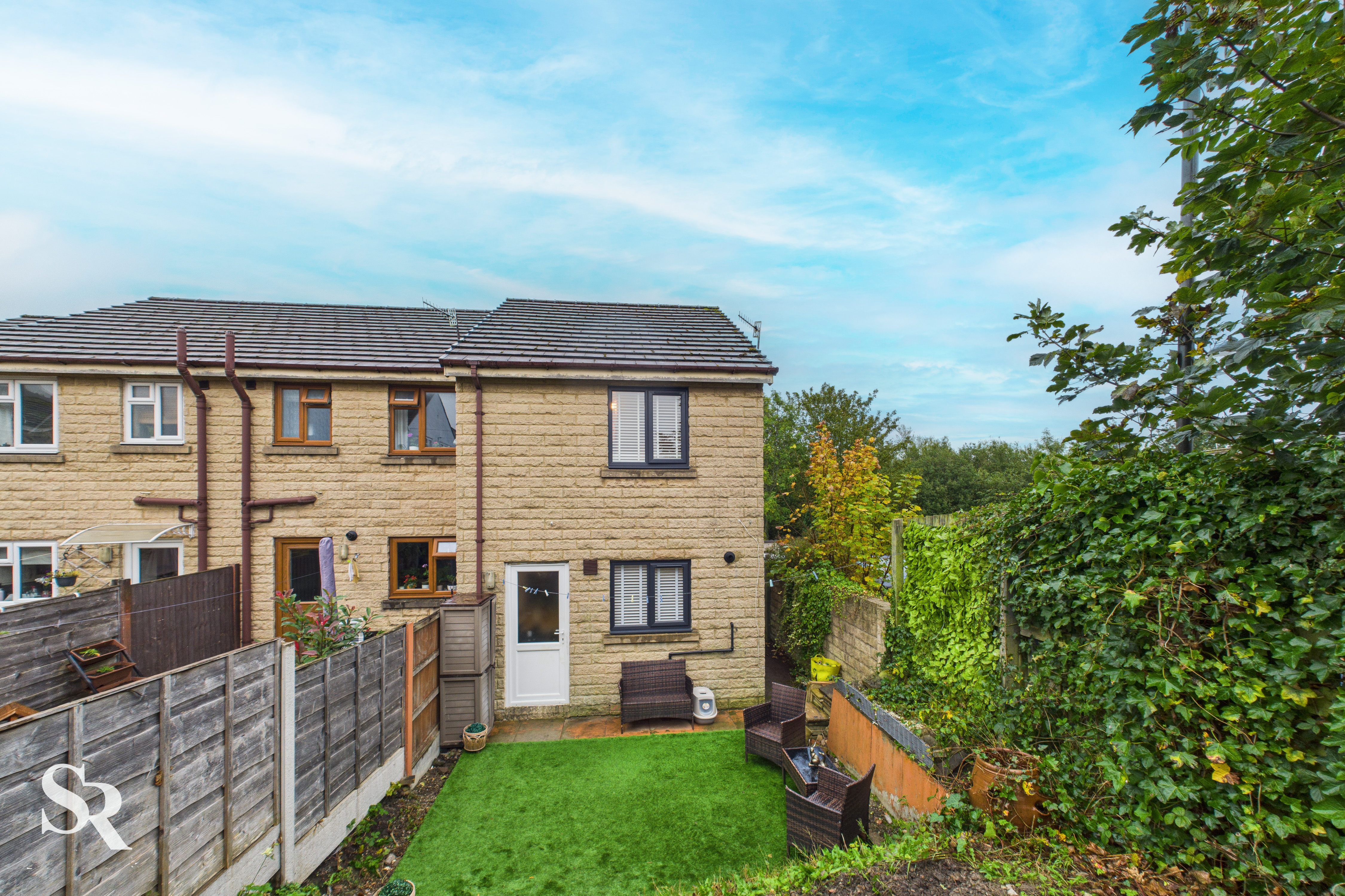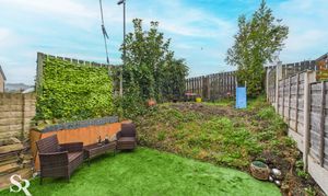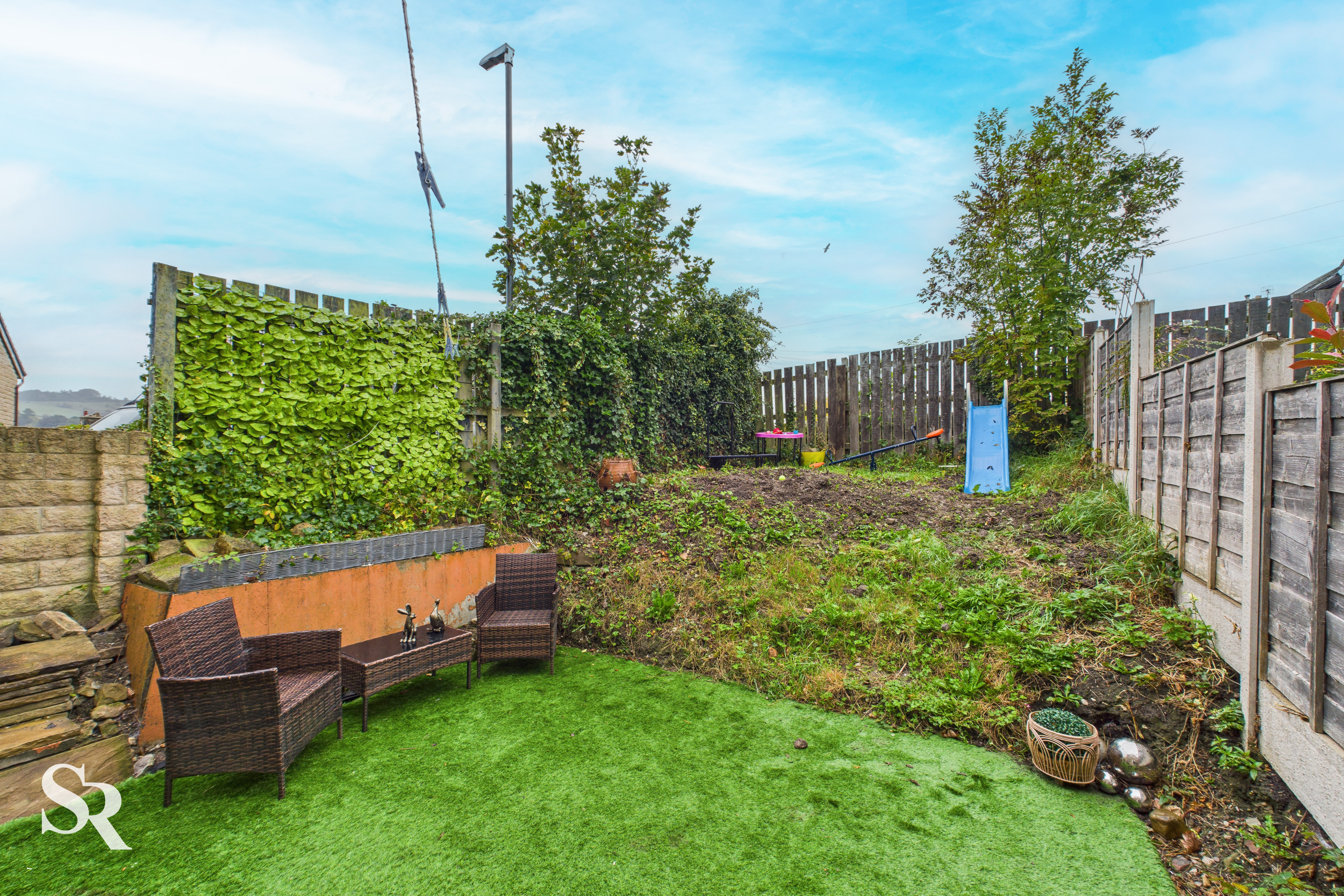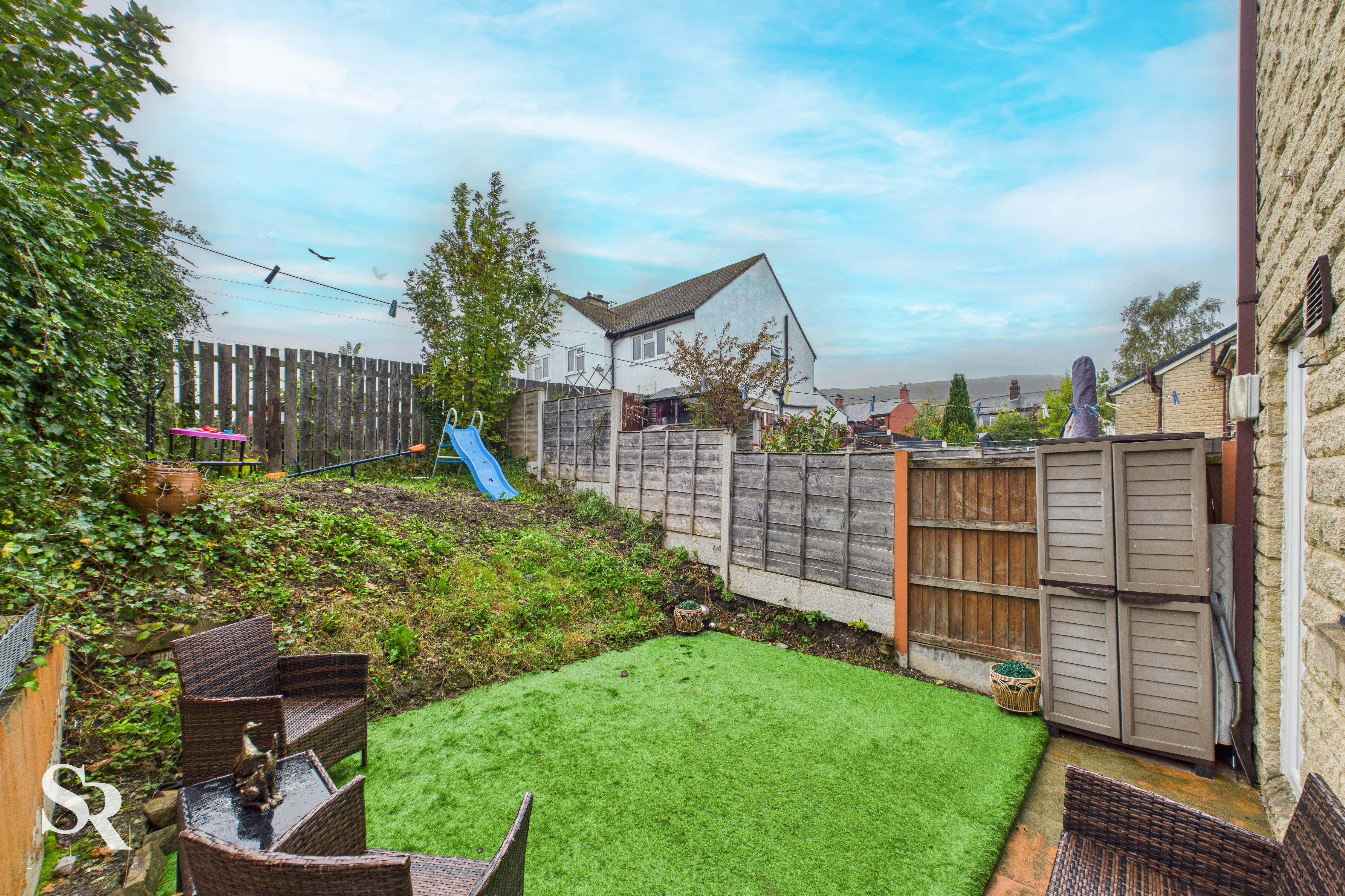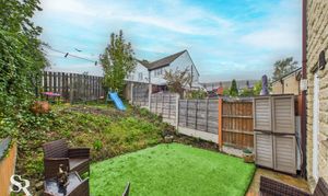 A split-level rear garden with a lower artificial lawn area and an upper bank. Currently in need of some landscaping, it offers excellent potential for the new owner to create a versatile and private outdoor space.