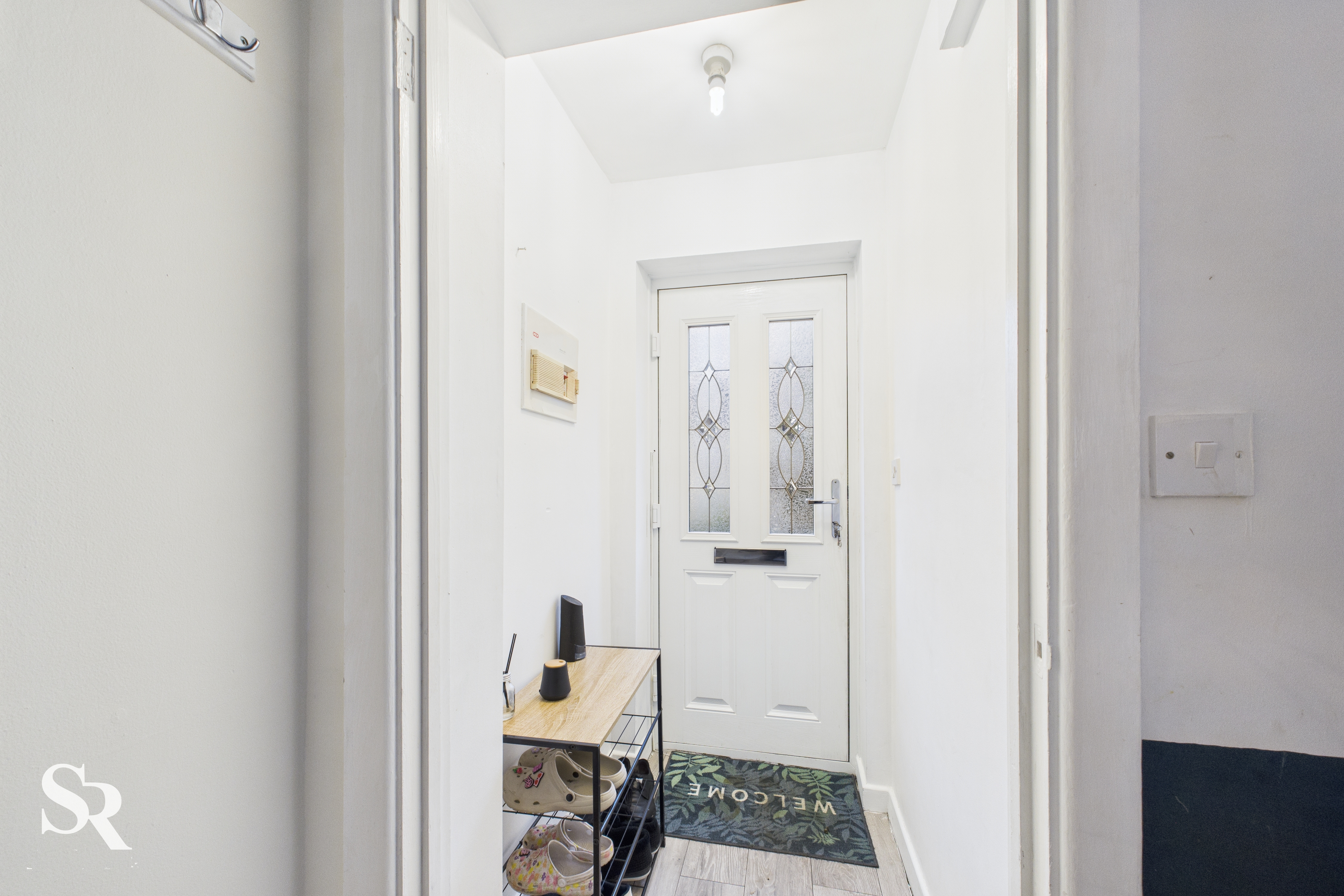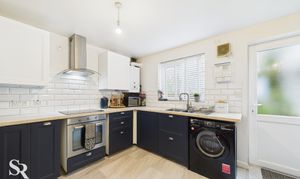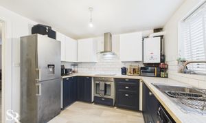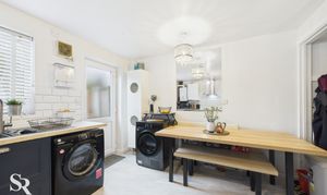 A stylish, functional space featuring laminate flooring and fitted with a range of modern wall and base units, complemented by a subway tile splashback. Integrated appliances include an under-counter oven/grill, four-plate electric hob, and extractor fan. There is space for an upright fridge/freezer and one under-counter appliance. A uPVC window (with a Venetian blind) and a uPVC door with privacy glass provide light and rear access. Includes a useful under-stairs storage area.