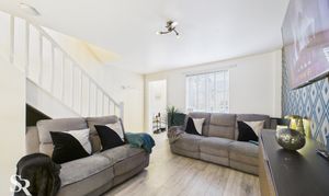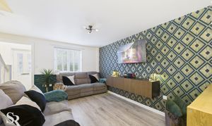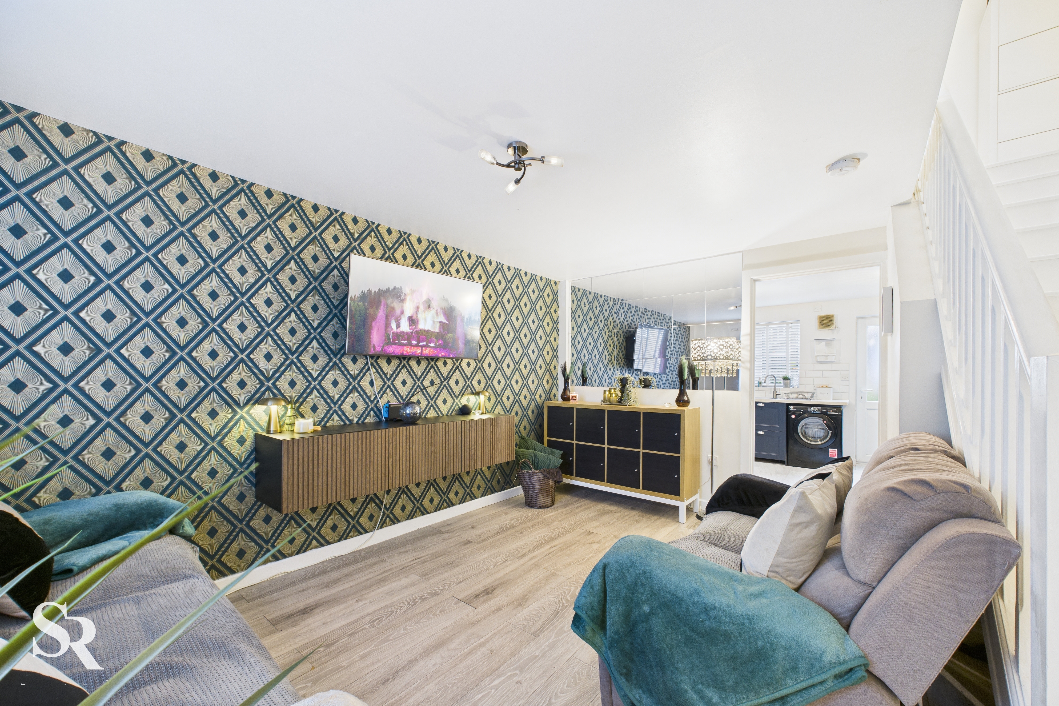 A comfortable and inviting space boasting laminate flooring and a uPVC window to the front aspect fitted with a Venetian blind. A feature wallpapered wall adds a plush, contemporary feel. White painted wooden stairs lead to the first floor, and the room provides a natural flow into the kitchen/dining.
