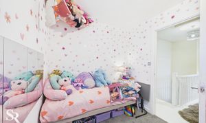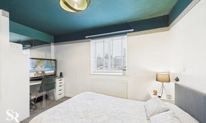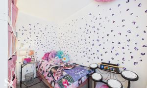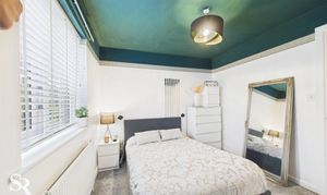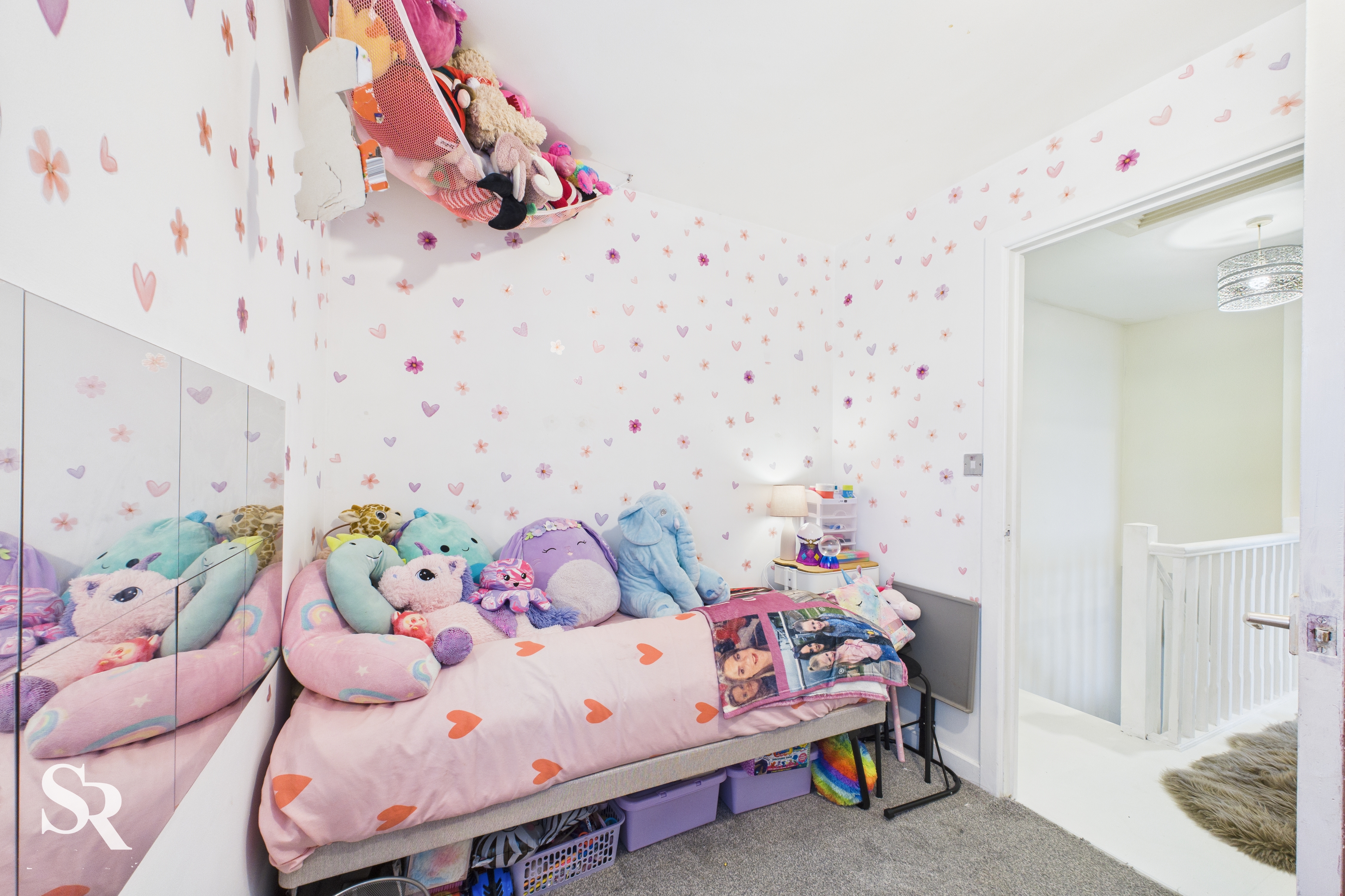 A well-proportioned double bedroom with carpeted flooring and a front-aspect uPVC window with a Venetian blind. Benefits from a handy over-stairs storage cupboard.