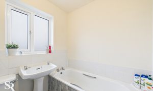 Fitted with modern herringbone-style vinyl flooring and a side-aspect uPVC window with frosted privacy glass. Features a bath with a tiled surround.