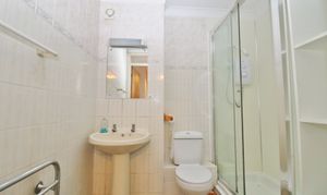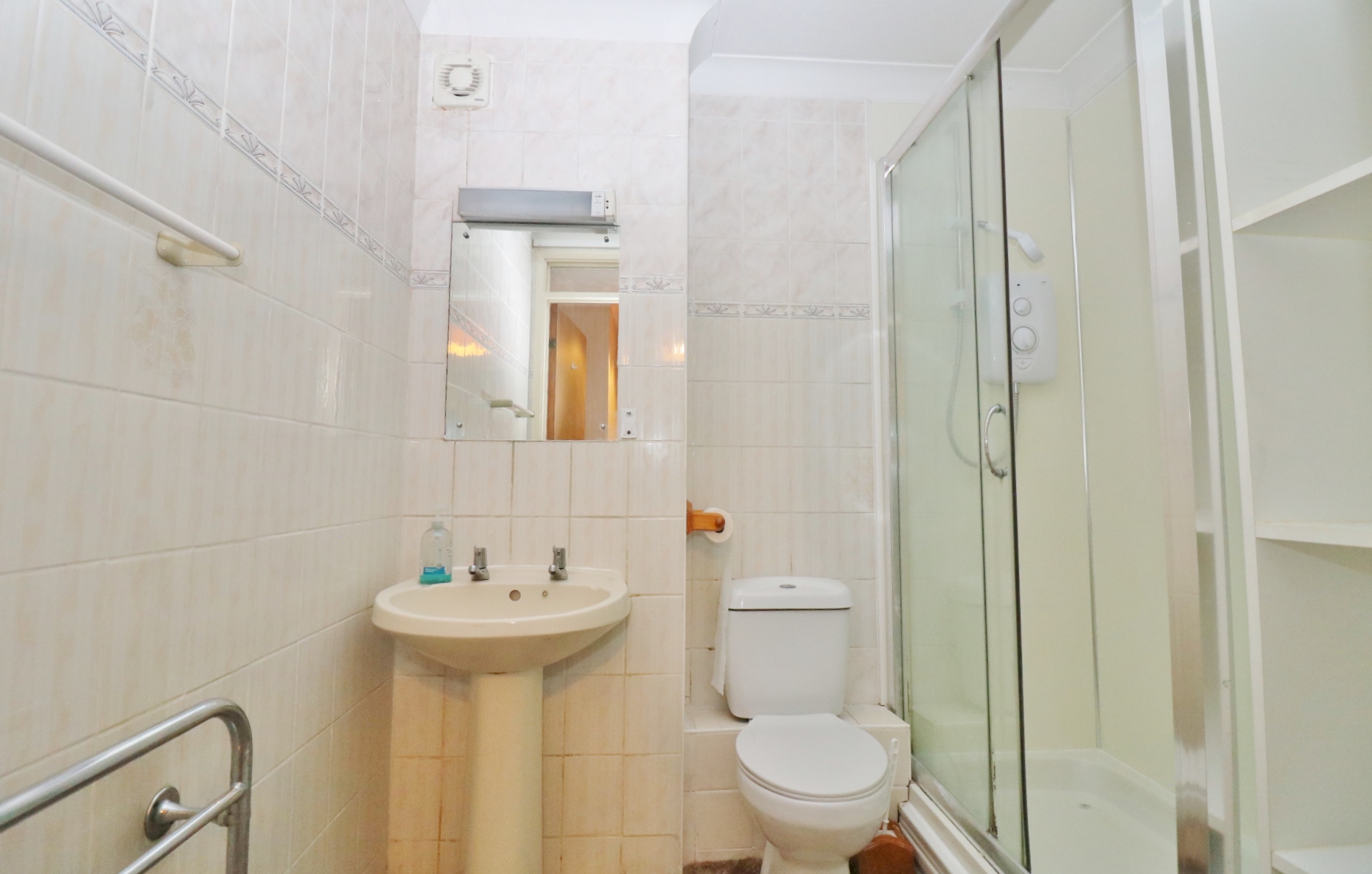 The shower room comprises a wash hand basin, WC and shower cubicle with an electric shower.