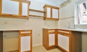 The kitchen faces the front of the property and has a range of wall and base units with space for free-standing appliances.