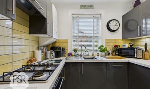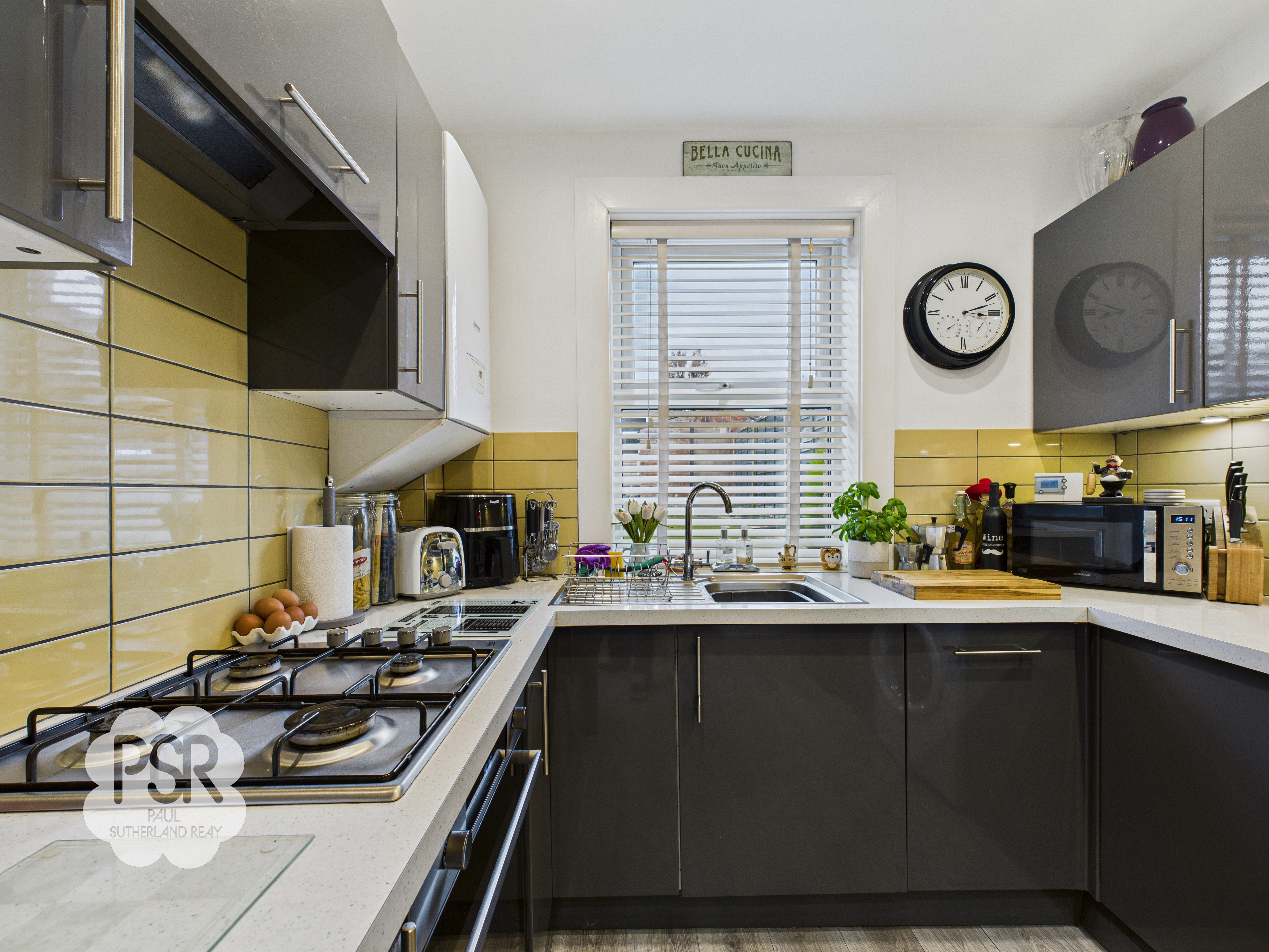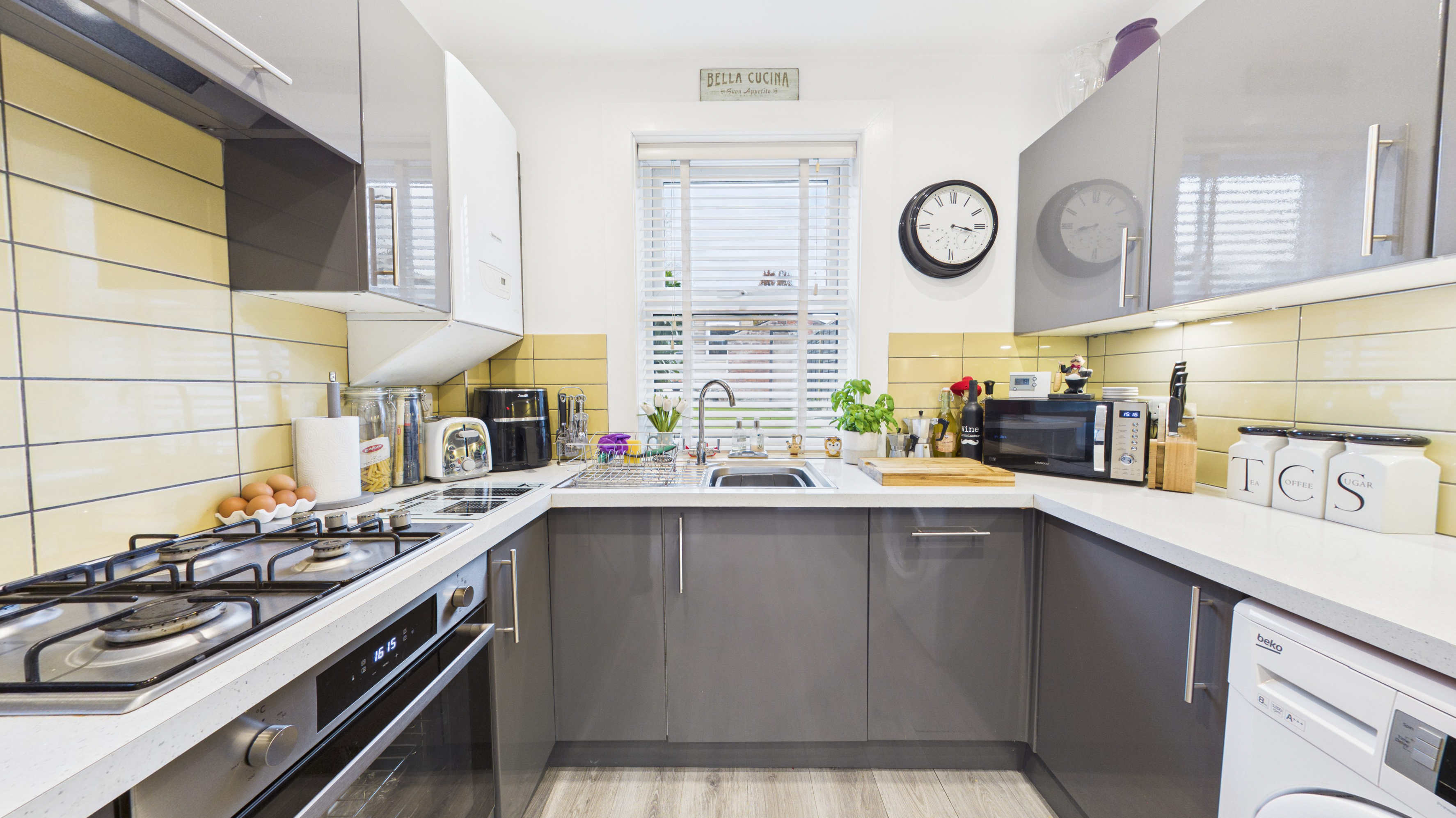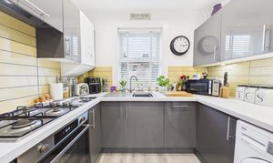 UPVC window facing the rear aspect. High gloss grey wall and base units with white quartz worktop, four ring gas hob electric fan oven with built in extractor over, stainless steel sink with mixer tap, yellow tiled splashbacks, integrated dishwasher, space for washing machine and fridge freezer, grey laminate flooring, double panel radiator and downlighters.
