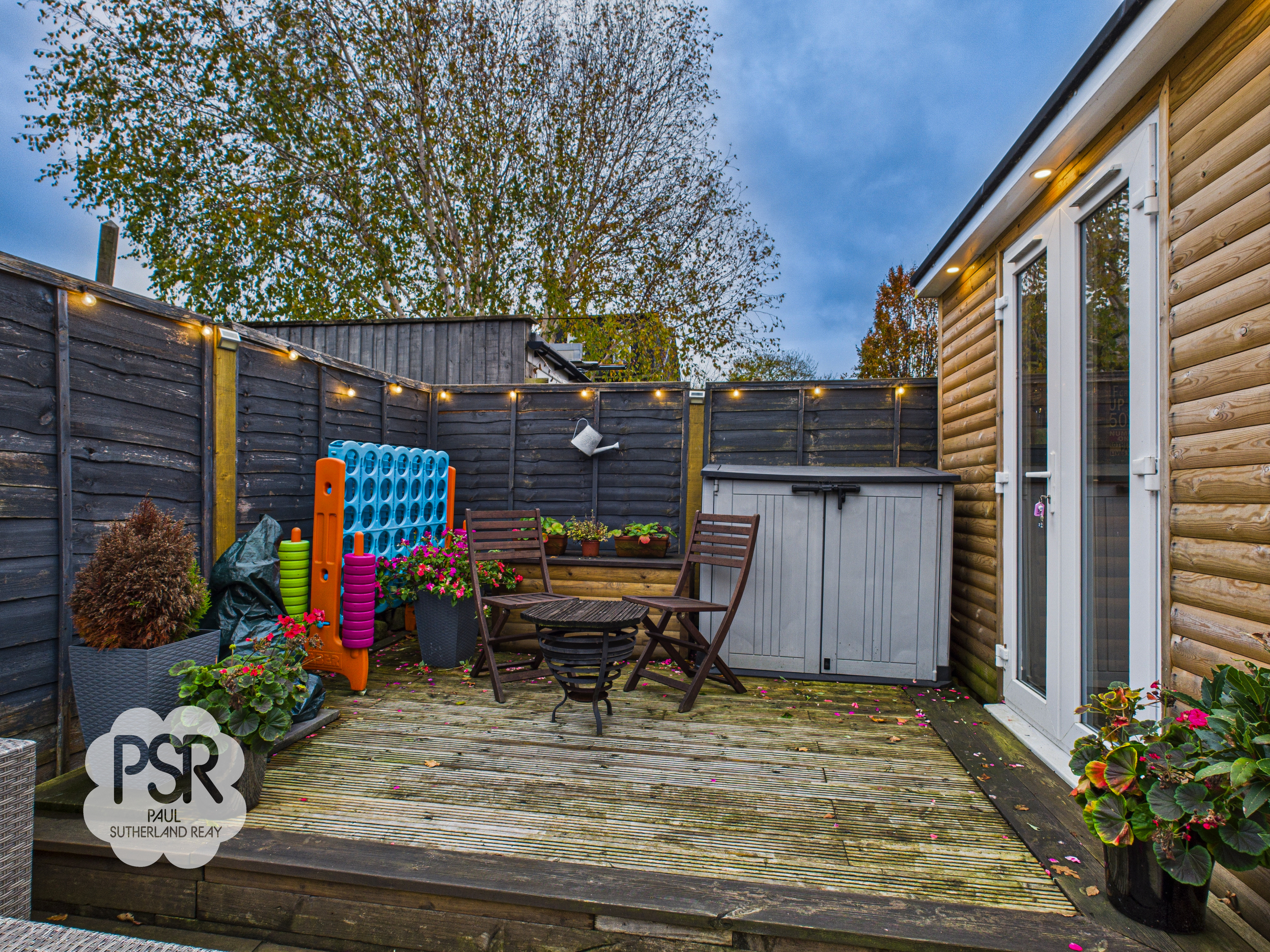 The rear garden begins with a stoned seating area and steps that lead up to a separate lawned area. Above this, there is another stone patio, and higher still, a fully decked area with more seating. This decked area provides access to the garden room and a brick shed.