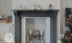 Large UPVC window facing the front aspect. The lounge features carpet flooring, a decorative fireplace with wooden mantel, a double panel radiator, and pendant light fitting.