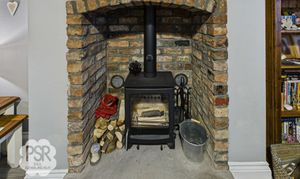 UPVC window facing the rear aspect. a brick feature fireplace with multifuel burner and stone hearth, light wood effect laminate flooring leading into kitchen area, double radiator and a pendant light fitting.