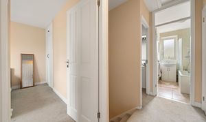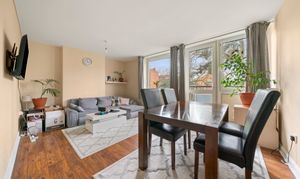 Situated on the third and fourth floors of a well-maintained development, the property opens into a welcoming entrance hall with a convenient guest WC. The modern kitchen is well-appointed with sleek units, contemporary worktops, a gas hob and oven, inset sink, and space for additional appliances. Adjacent, a generous reception room is flooded with natural light—ideal for both relaxing and entertaining—and provides direct access to a private balcony with a pleasant green outlook.