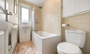 Upstairs, the principal bedroom benefits from built-in wardrobes, alongside a further double bedroom and a spacious single bedroom large enough to accommodate a double bed. A stylish family bathroom completes this level, featuring modern tiling and a classic white suite. Excellent storage is available throughout, including three large cupboards on the upper floor, as well as a boarded loft providing additional space.