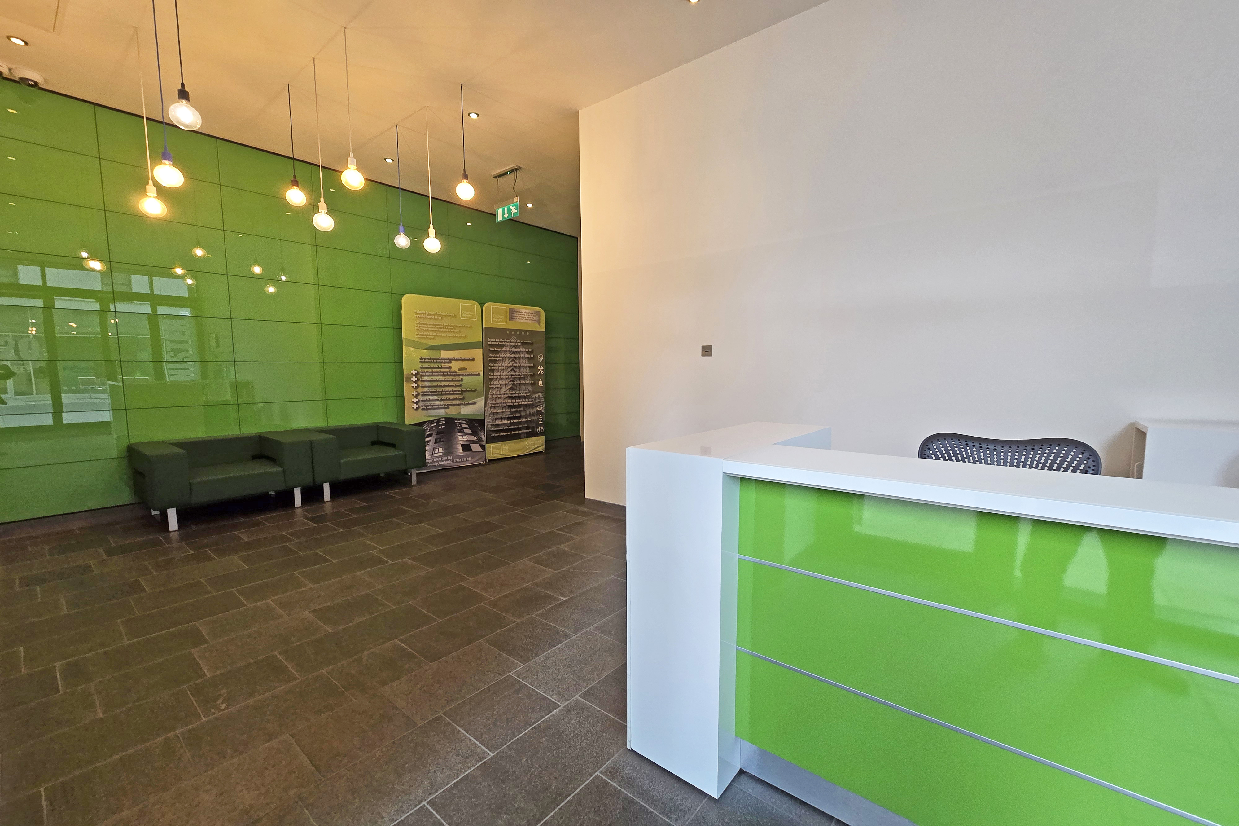 Accessed via vendor intercom entry system. A welcoming reception area, with desk for concierge, seating area, doors to communal garden, lifts to all floors.