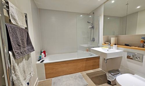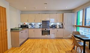 A light and bright room, with two windows to side, patio doors to balcomy allowing natural light to flood in. Engineered wood flooring, ceiling spots, under floor heating. Open plan living to kitchen area.