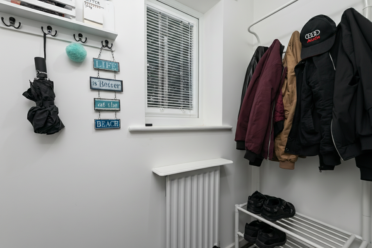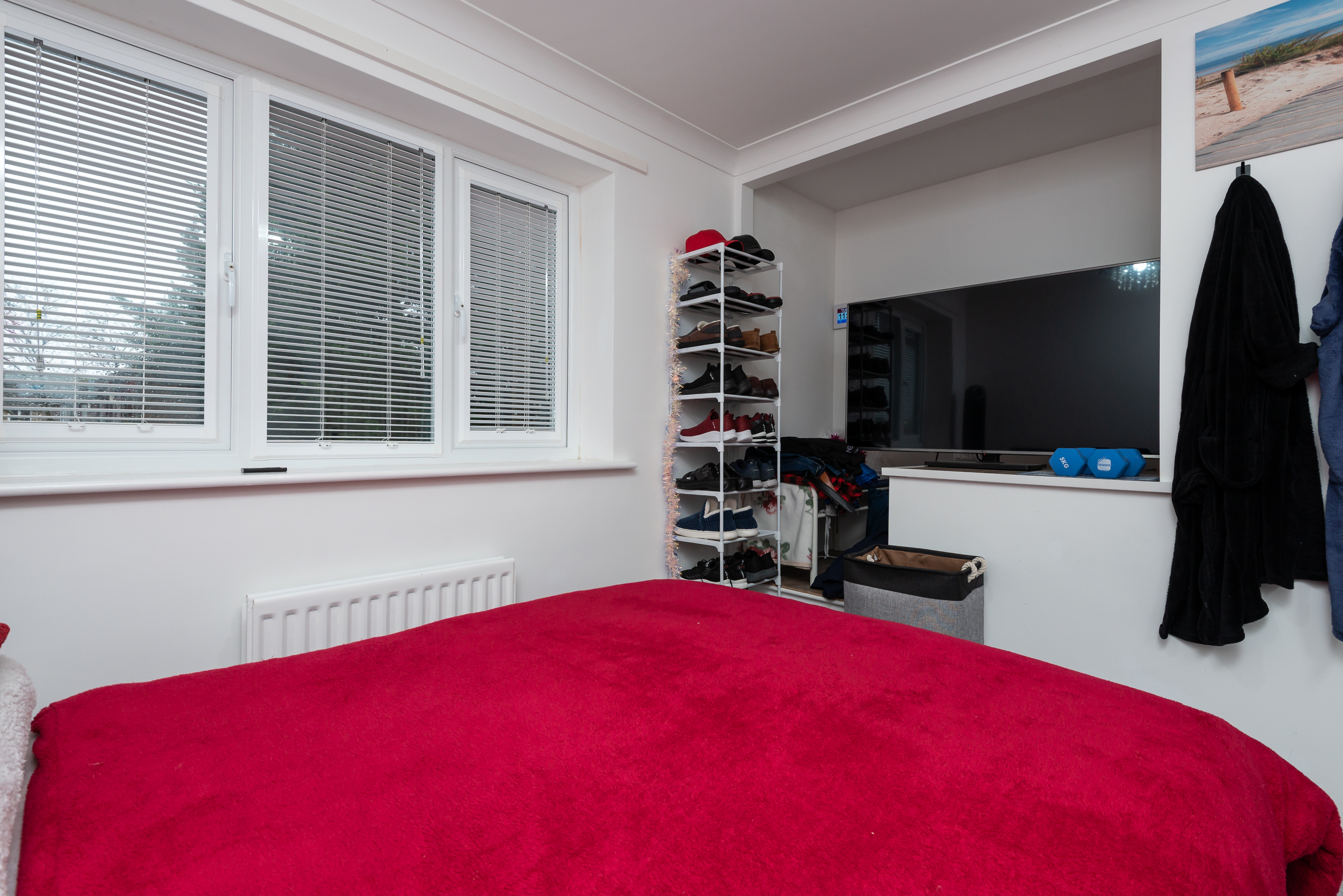 With laminate flooring, storage cupboard, radiator, and windows.
