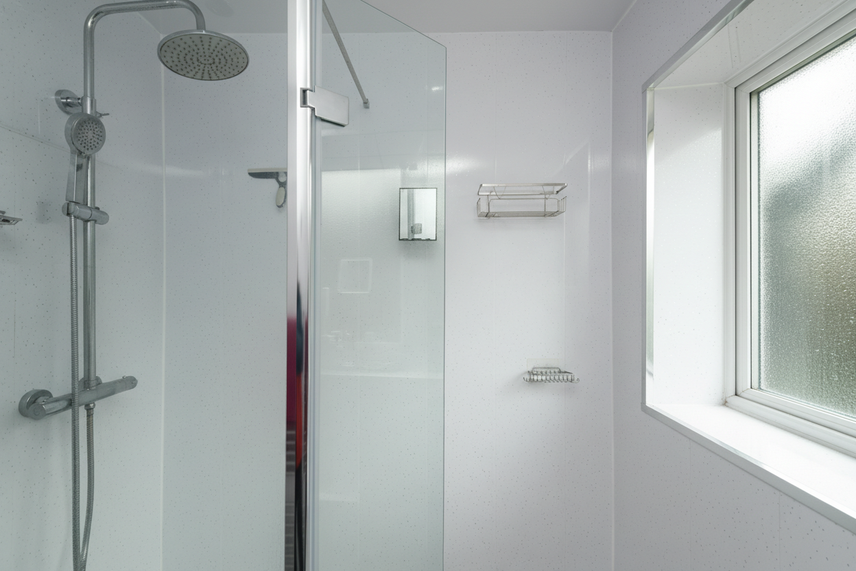 With laminate flooring, panelled wall, toilet, wash basin on vanity unit, walk in shower, radiator, and window.