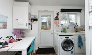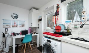 With laminate flooring, slab style kitchen units, integrated oven and electric hob, extractor fan, space for Fridge Freezer and washing machine, tiled back splash, door to rear garden, radiator, and window.