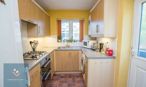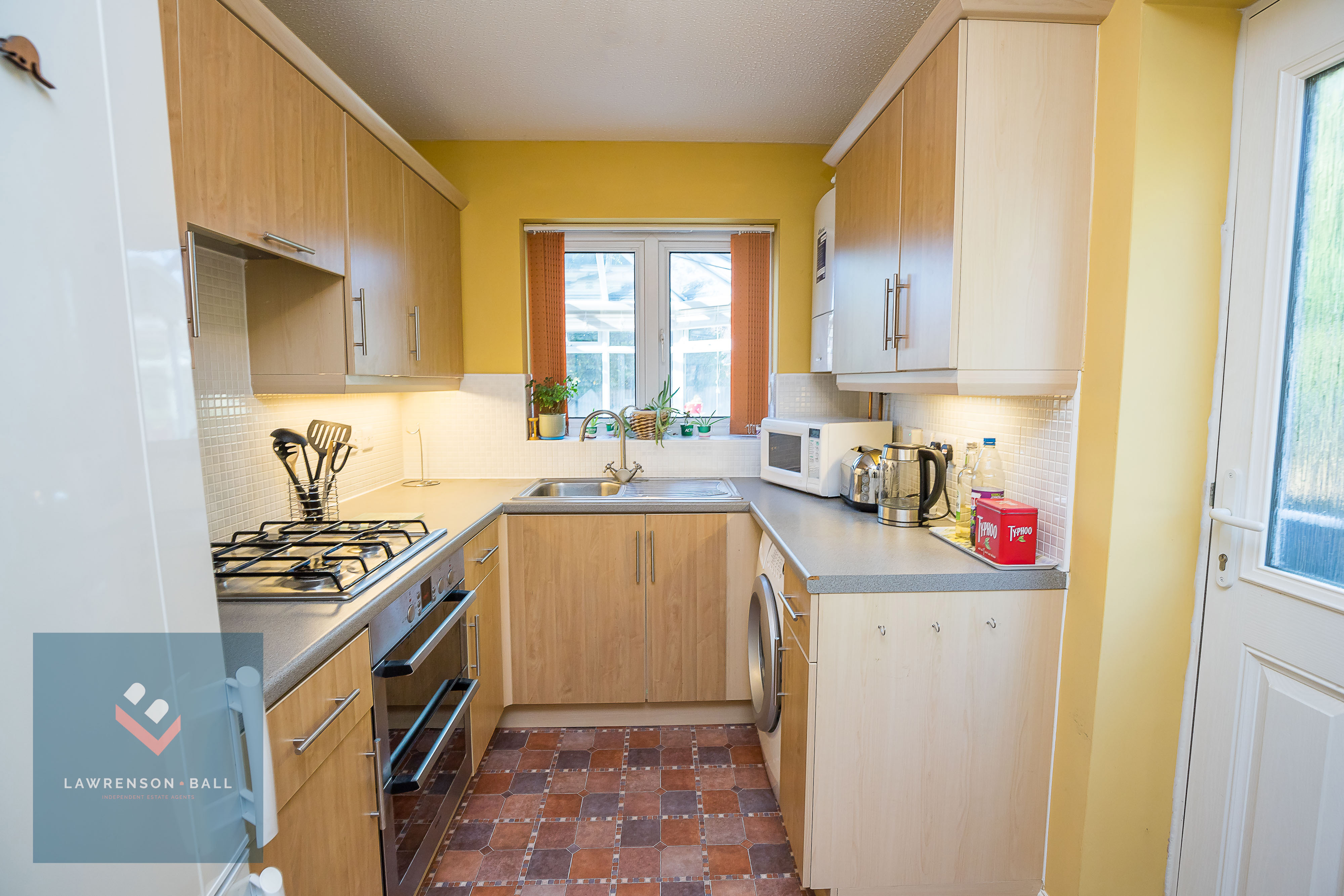 Fitted with a range of wall and base units with work surface over and stainless steel sink drainer unit. Integrated double oven and hob with extractor hood over. Plumbing and space for freestanding washing machine. Space for fridge/freezer. Mains gas fired combination central hearing boiler installed 2024. Double glazed window to rear and double glazed door to side. Under stairs storage cupboard.
