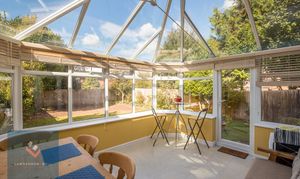 To the front of the property is a lawned garden with beds containing a variety of mature shrubs. A driveway provides off road parking and leads to the detached garage. Two side access gates give access to the rear and side gardens.