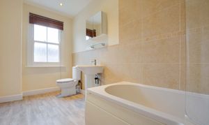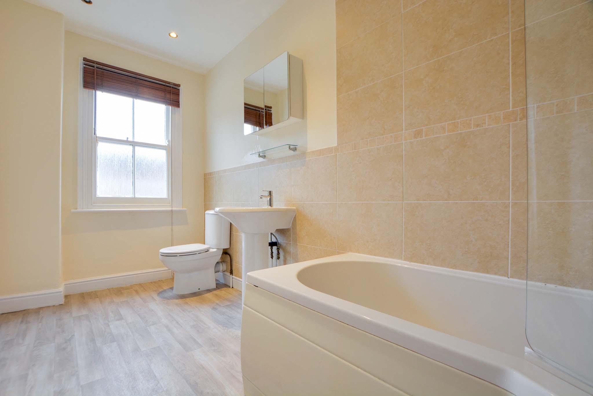 A generous family bathroom featuring an obscured glazed sash window for privacy. The suite includes a bath with a shower and screen, a low-level WC, a wash hand basin with tiled splashbacks, a built-in wall-mounted unit, and a radiator.