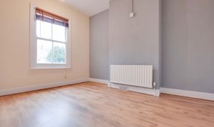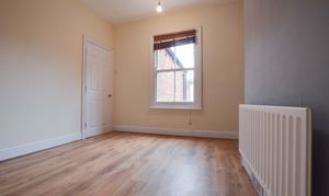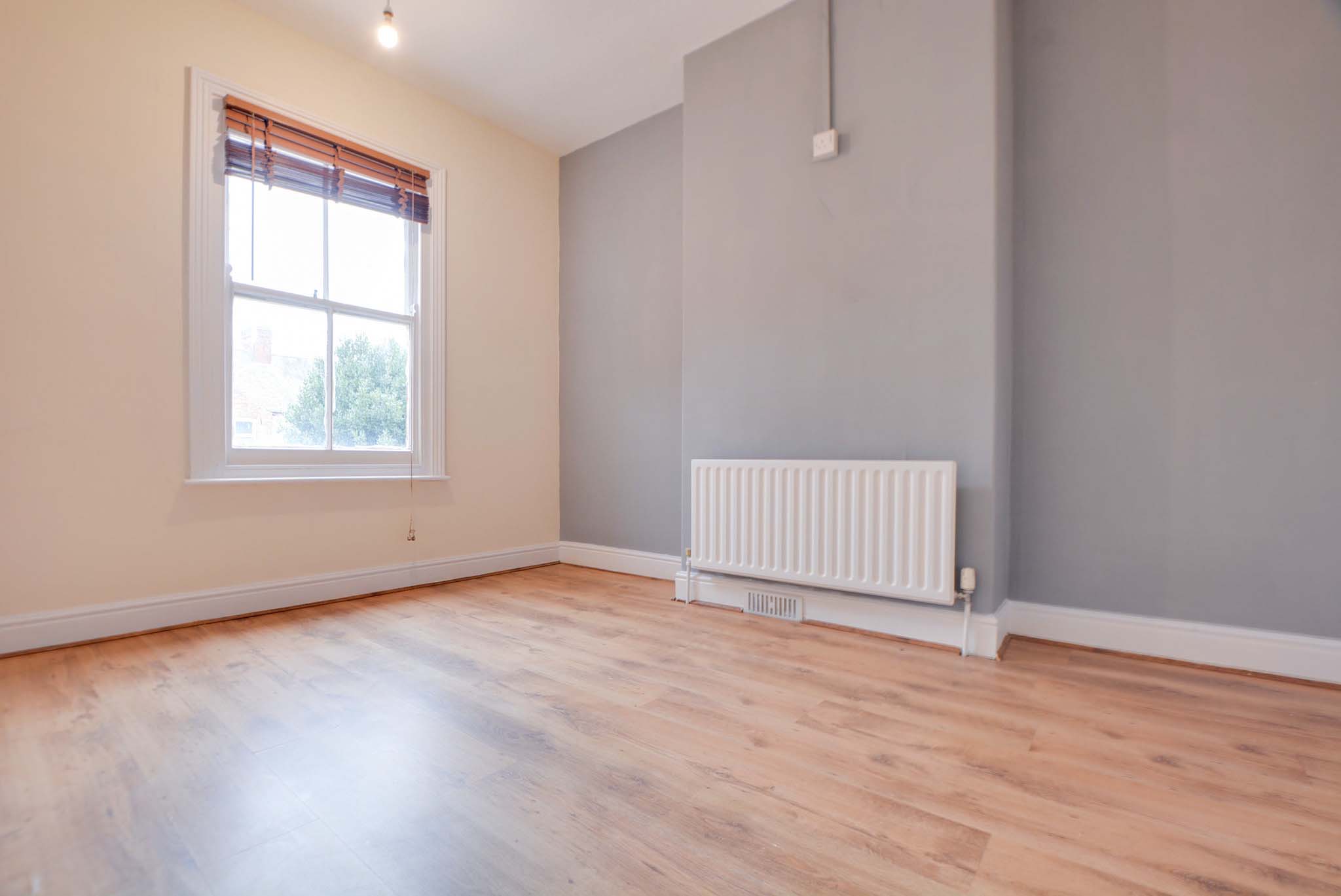 This second double bedroom offers wood-effect flooring and a central chimney breast. It includes a practical built-in over-stairs storage cupboard, a radiator, and a classic single-glazed sash window overlooking the rear.