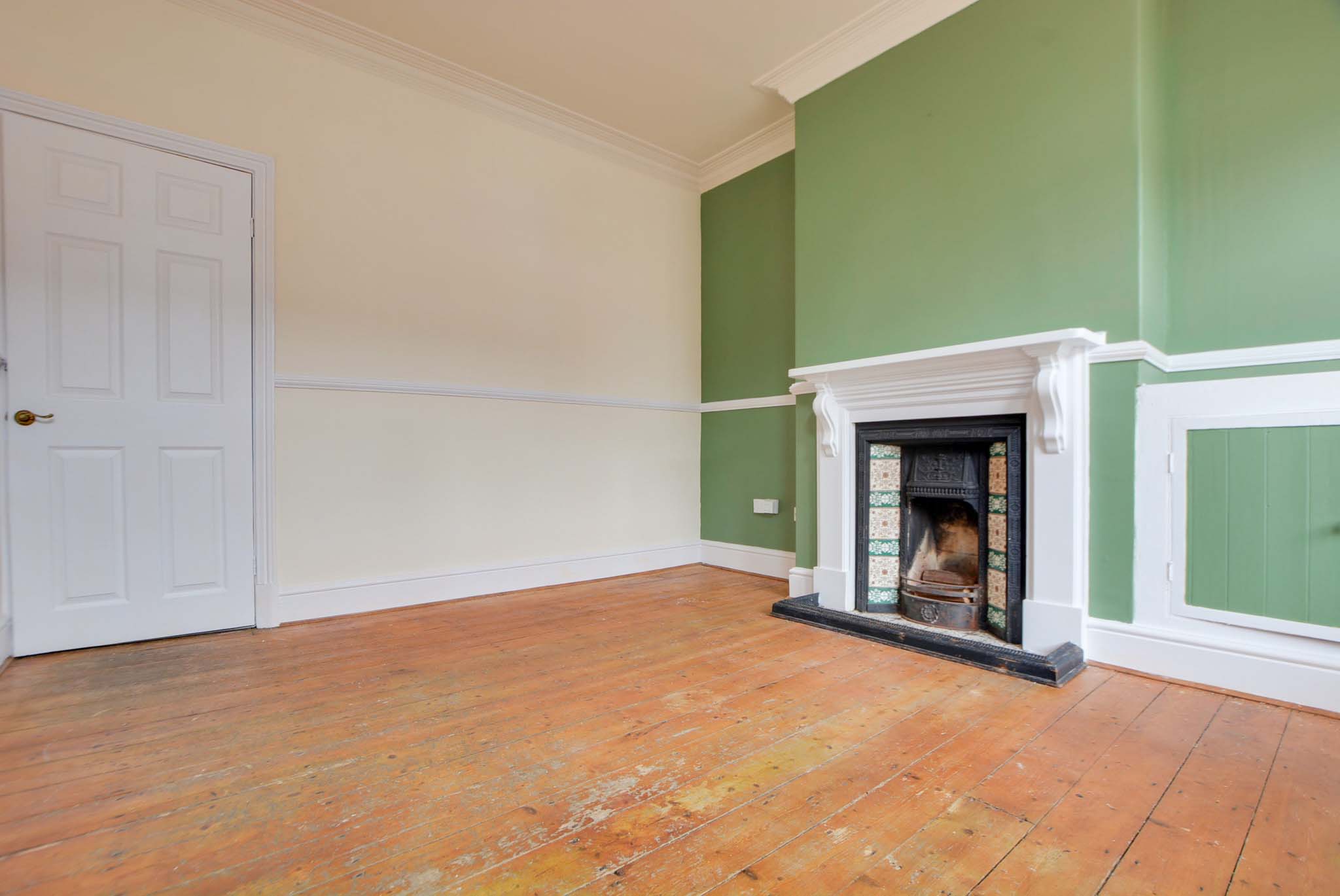 This inviting primary living space is centered around a feature fireplace and a large bay window that floods the room with natural light. The room is finished with vibrant green walls and a matching chimney breast, complemented by classic coving to the ceiling, a traditional dado rail, wooden flooring, and a radiator